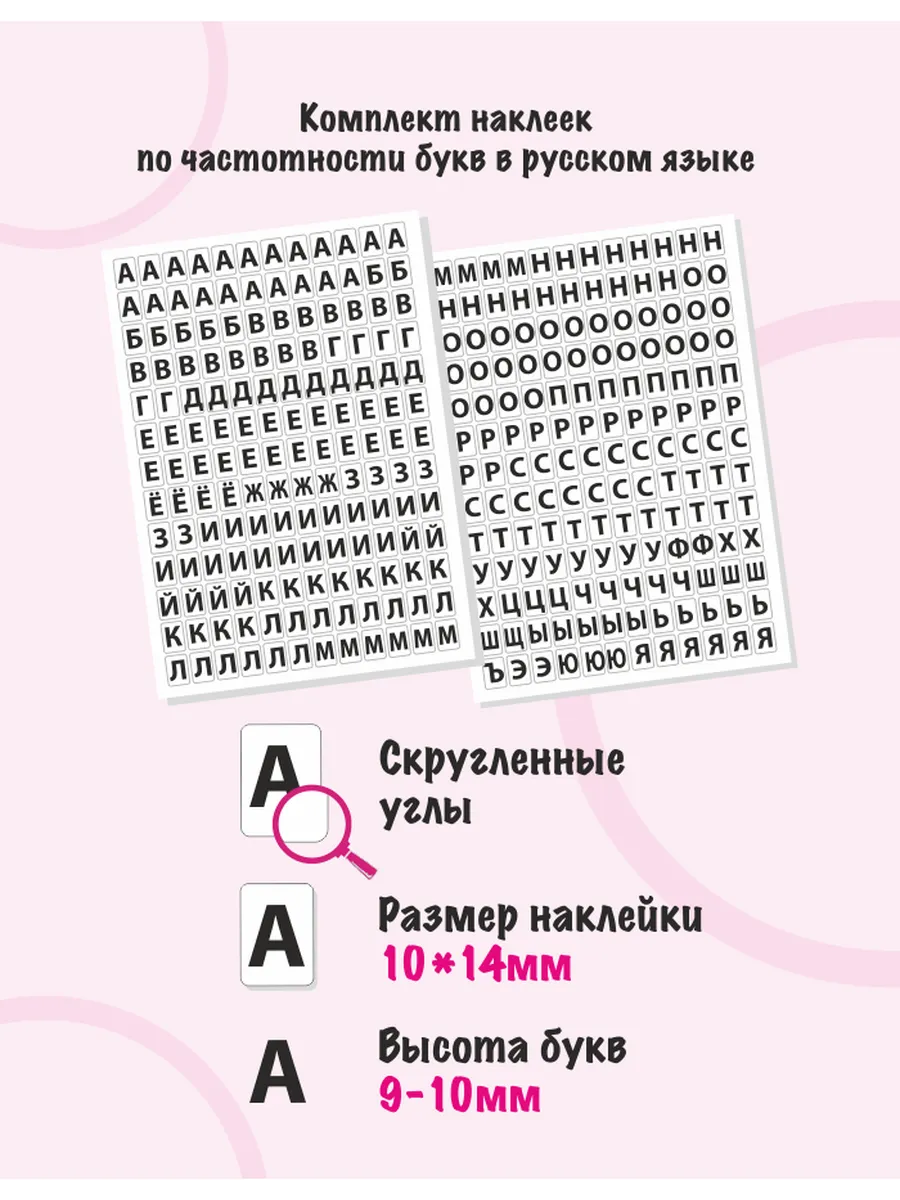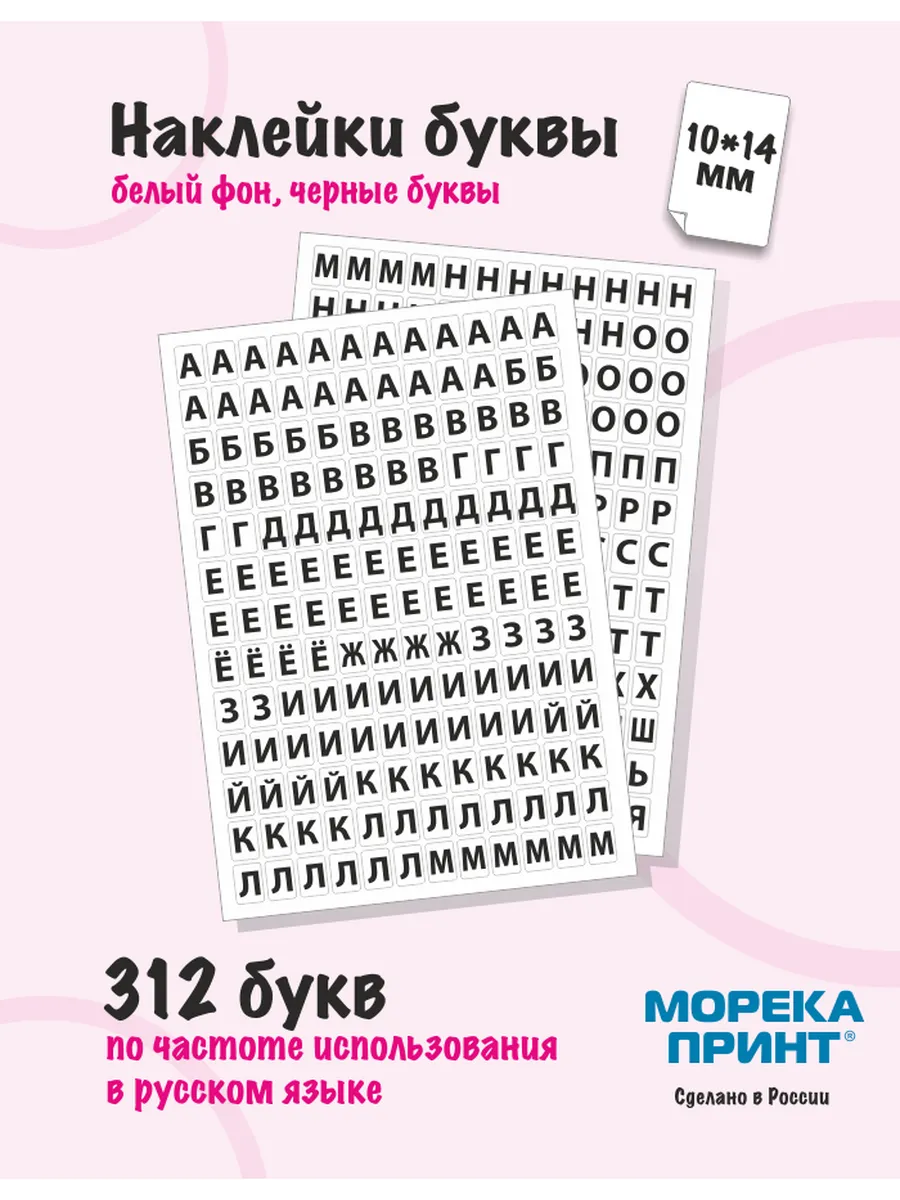 Наклейки буквы русские, заглавные. Набор из 312 букв алфавита подобранных по частоте использования в русском языке. Дополнительно в наборе 30 цифр и 48 символов.