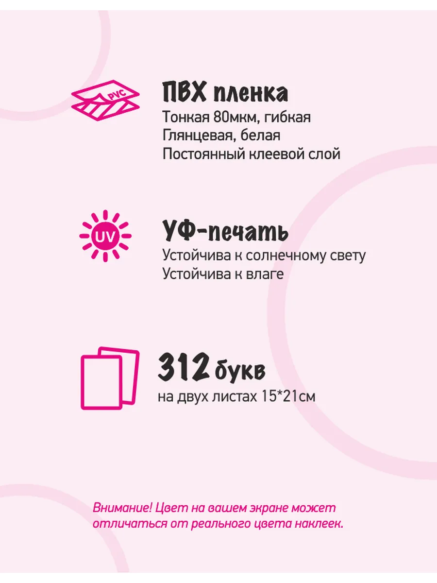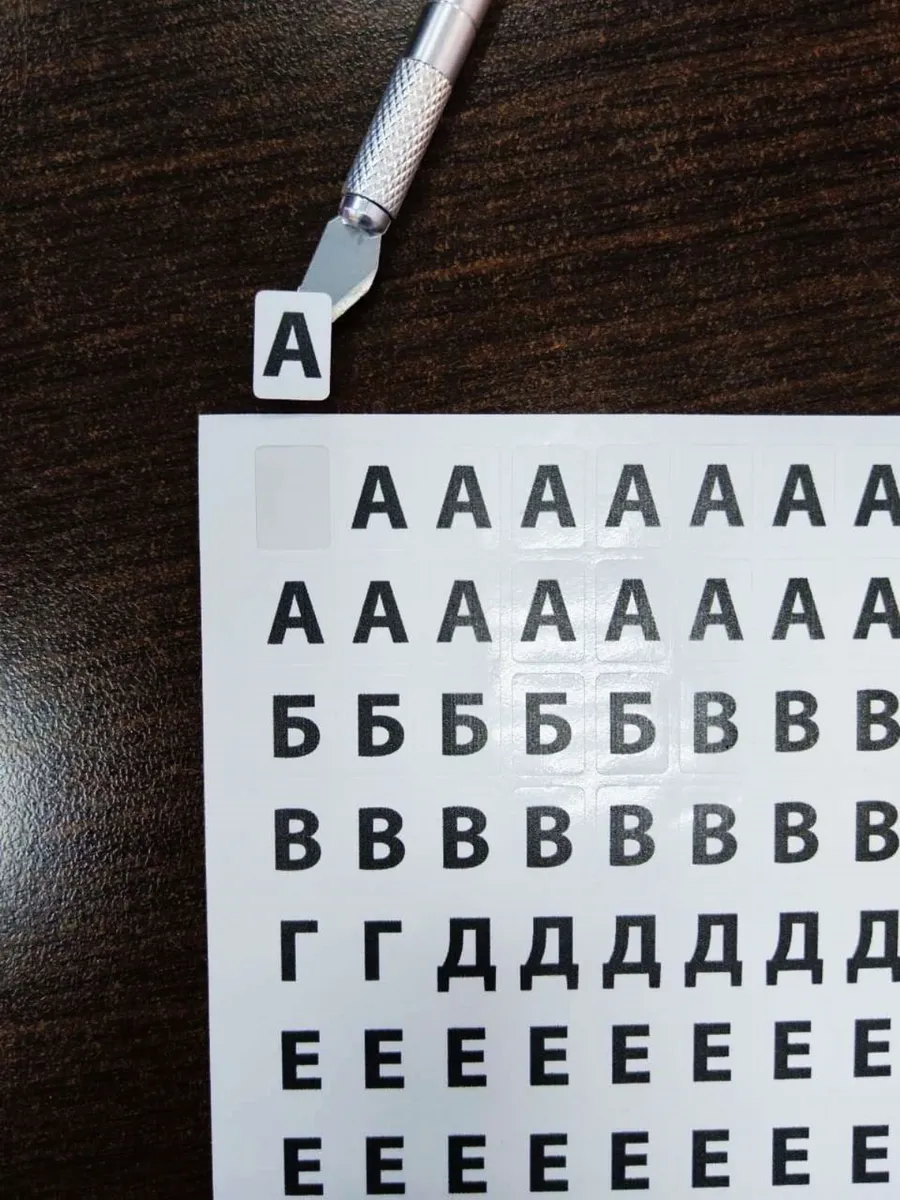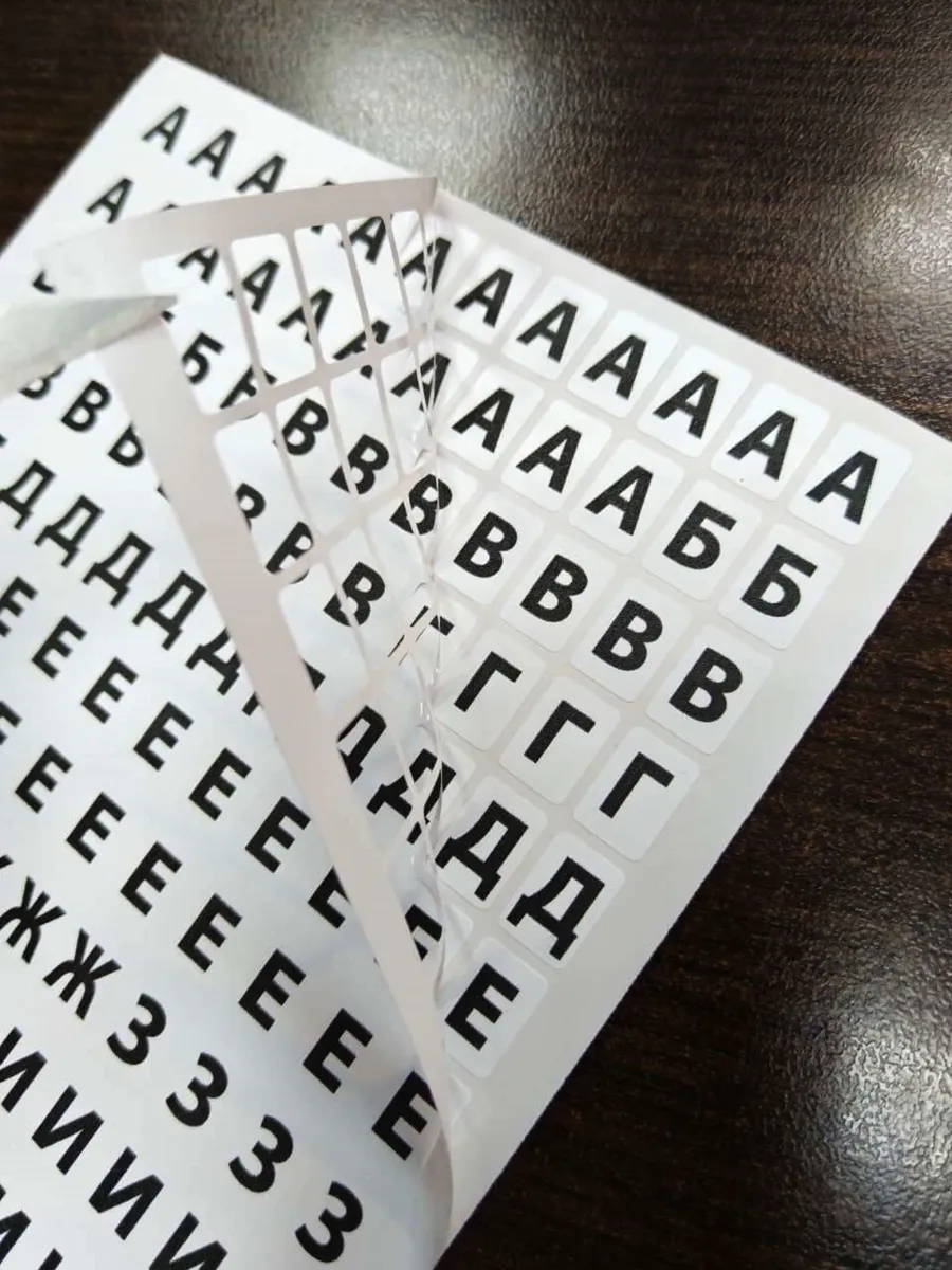 Наклейки изготовлены из самокклеящейся виниловой белой пленки с ультрафиолетовой печатью букв. Высота буквы 9-10мм. Каждая буква располжена на белом прямоугольном фоне 10*14мм со скругленными углами.