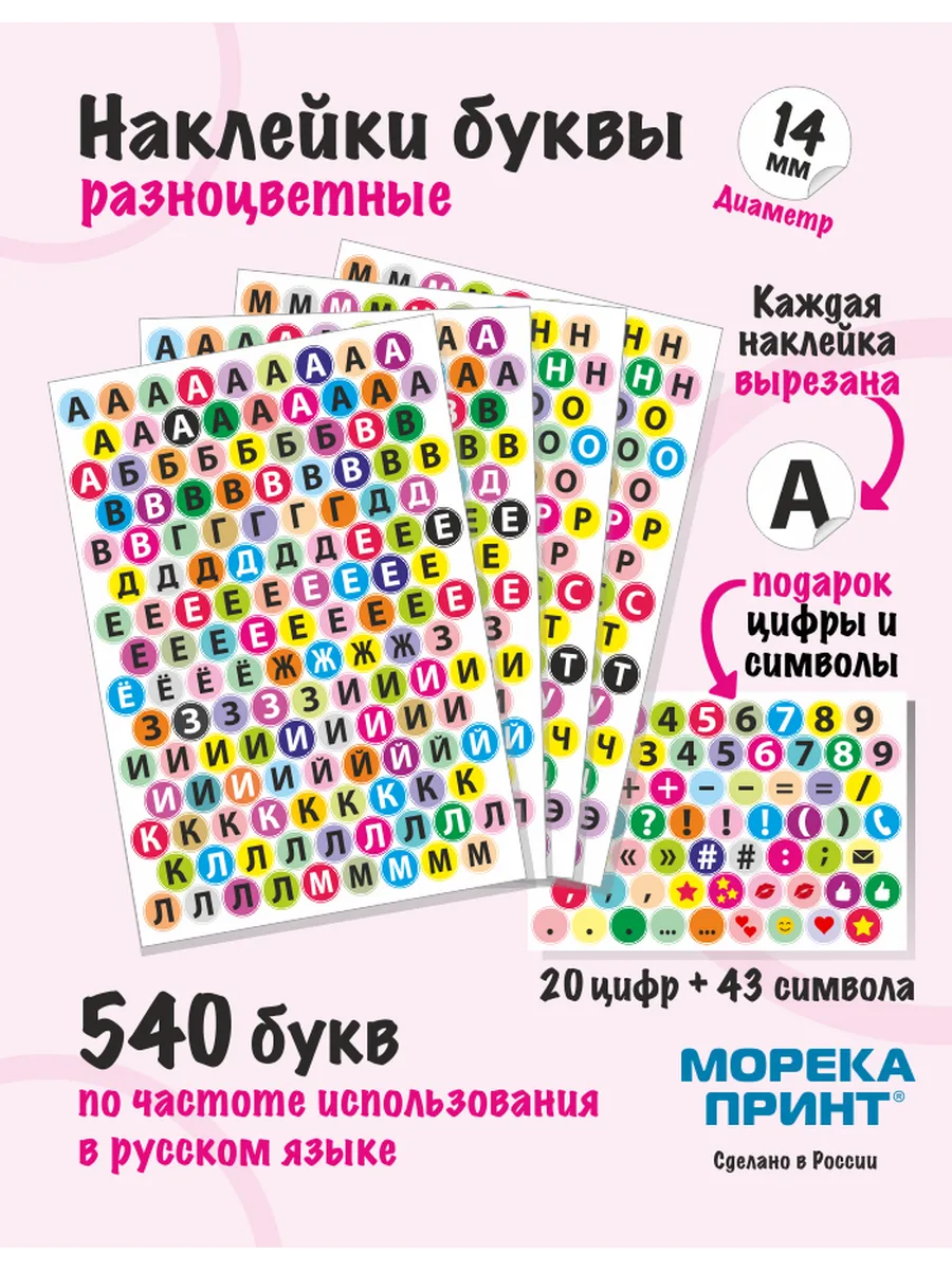 Наклейки буквы русские заглавные, черные и белые буквы на разноцветном фоне. Набор из 540 букв алфавита подобранных по частоте использования в русском языке. Дополнительно в комплекте 43 символа и 20 цифр.