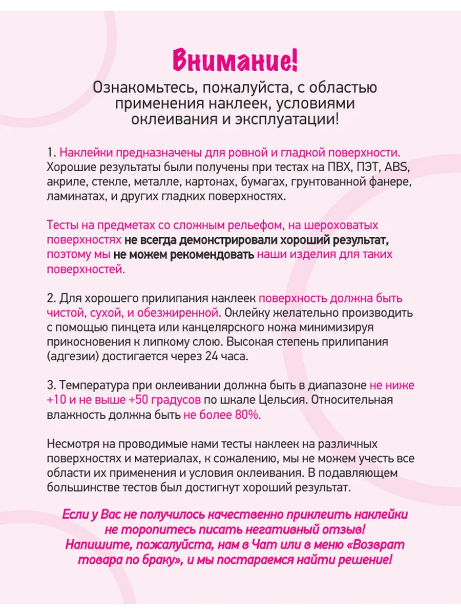 Наклейки изготовлены из самоклеящейся виниловой белой пленки с ультрафиолетовой печатью символов. Каждый символ расположен на белом круглом фоне диаметром 14мм.