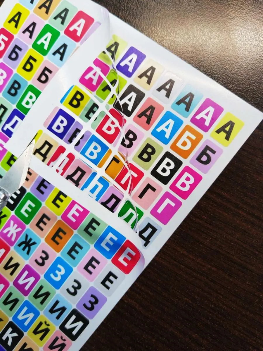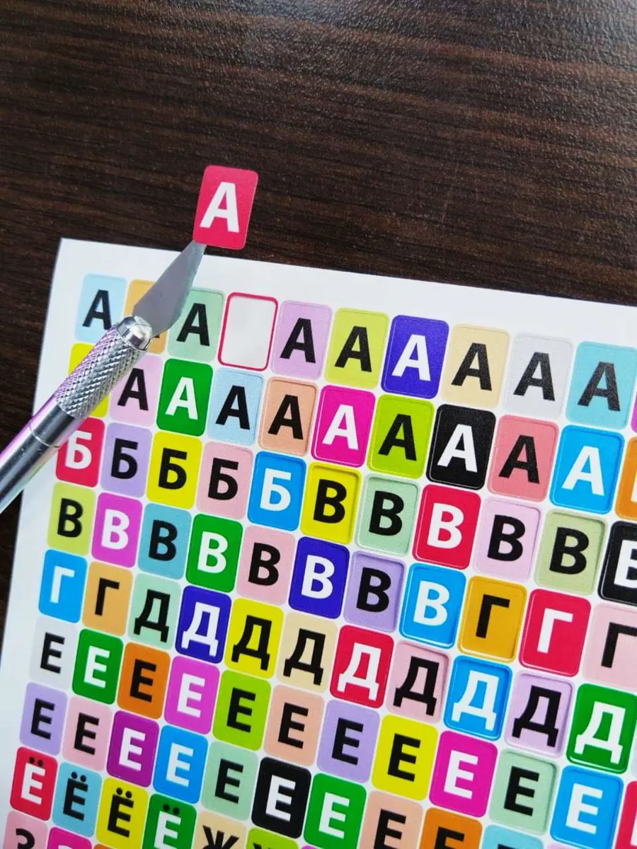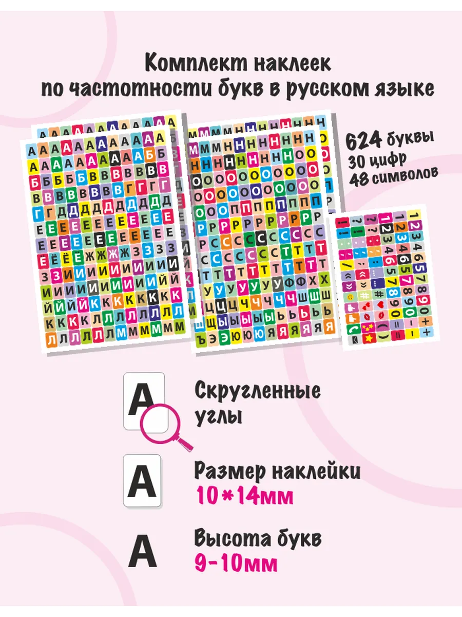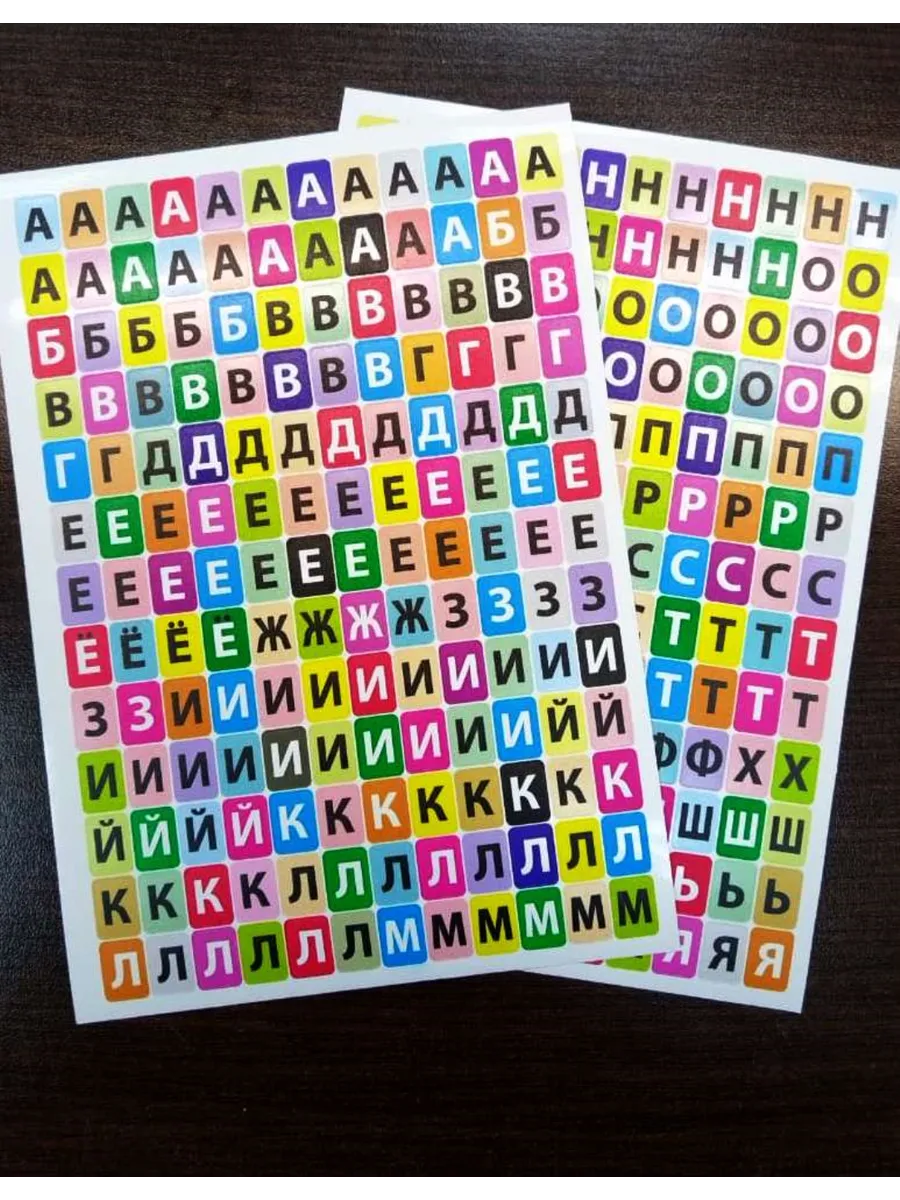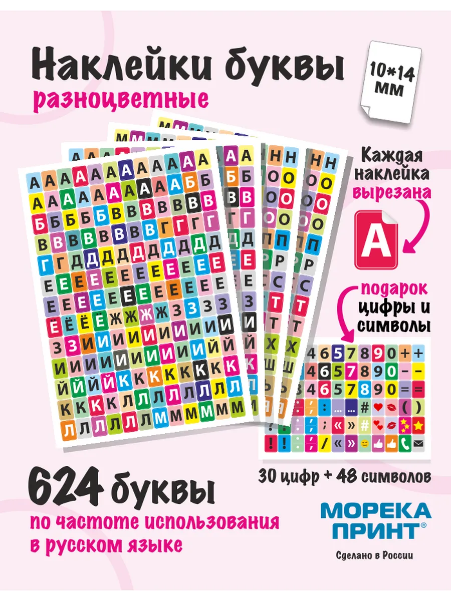 Наклейки буквы русские цветные, заглавные. Набор из 624 букв алфавита подобранных по частоте использования в русском языке. Дополнительно в комплекте 48 символов и 30 цифр.