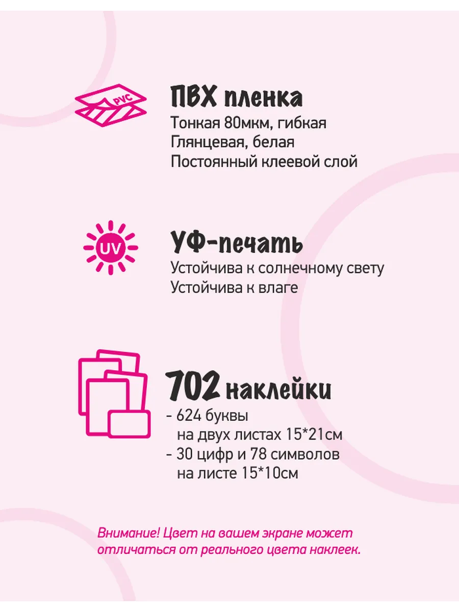 Наклейки изготовлены из самоклеящейся виниловой белой пленки с ультрафиолетовой печатью букв. Высота буквы 9-10мм. Каждая буква расположена на белом прямоугольном фоне 10*14мм со скругленными углами.
