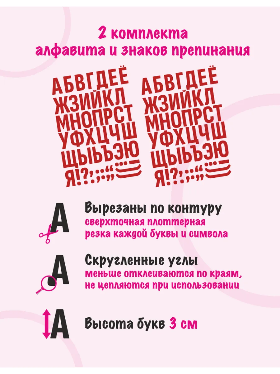 Представляем вам набор наклеек "Русский алфавит" от МорекаПринт – настоящий клад для творчества и обучения! В этом наборе вы найдете два комплекта алфавита с буквами высотой 3 см и два комплекта знаков препинания, которые станут незаменимыми помощниками в самых разных ситуациях. Вырезанные по контуру буквы и знаки препинания, готовы украсить ваши проекты, тетради, подарки и многое другое. Каждая буква вырезана, не имеет фона, что позволяет легко наклеить ее на любую поверхность, и это будет выглядеть стильно!