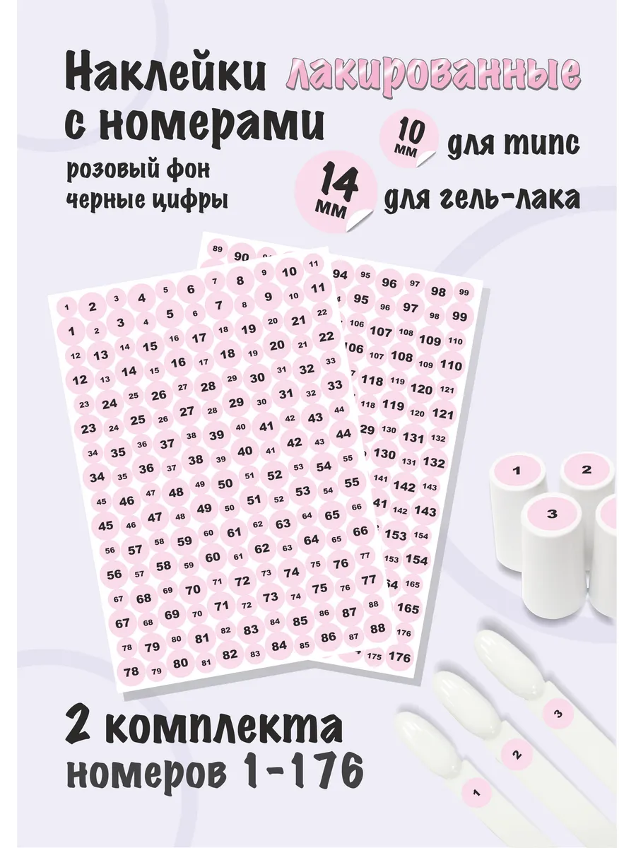 Наклейки c номерами парные круглые для типс и гель лаков. Стикеры для нумерации круглые диаметром 10мм и 14мм с номерами от 1 до 176 каждого диаметра. Всего 352 наклейки обоих диаметров. Вырезаны по контуру и расположены на двух листах 15*21см.