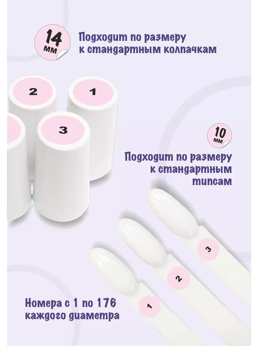 Наклейки диаметром 14мм идеально подходят на верхнюю часть стандартных пластиковых колпачков флакончиков гель лаков, а наклейки 10мм помещаются на большинство станадртных типс. Поэтому такой набор еще лучше будет смотерться на вашей коллекции.