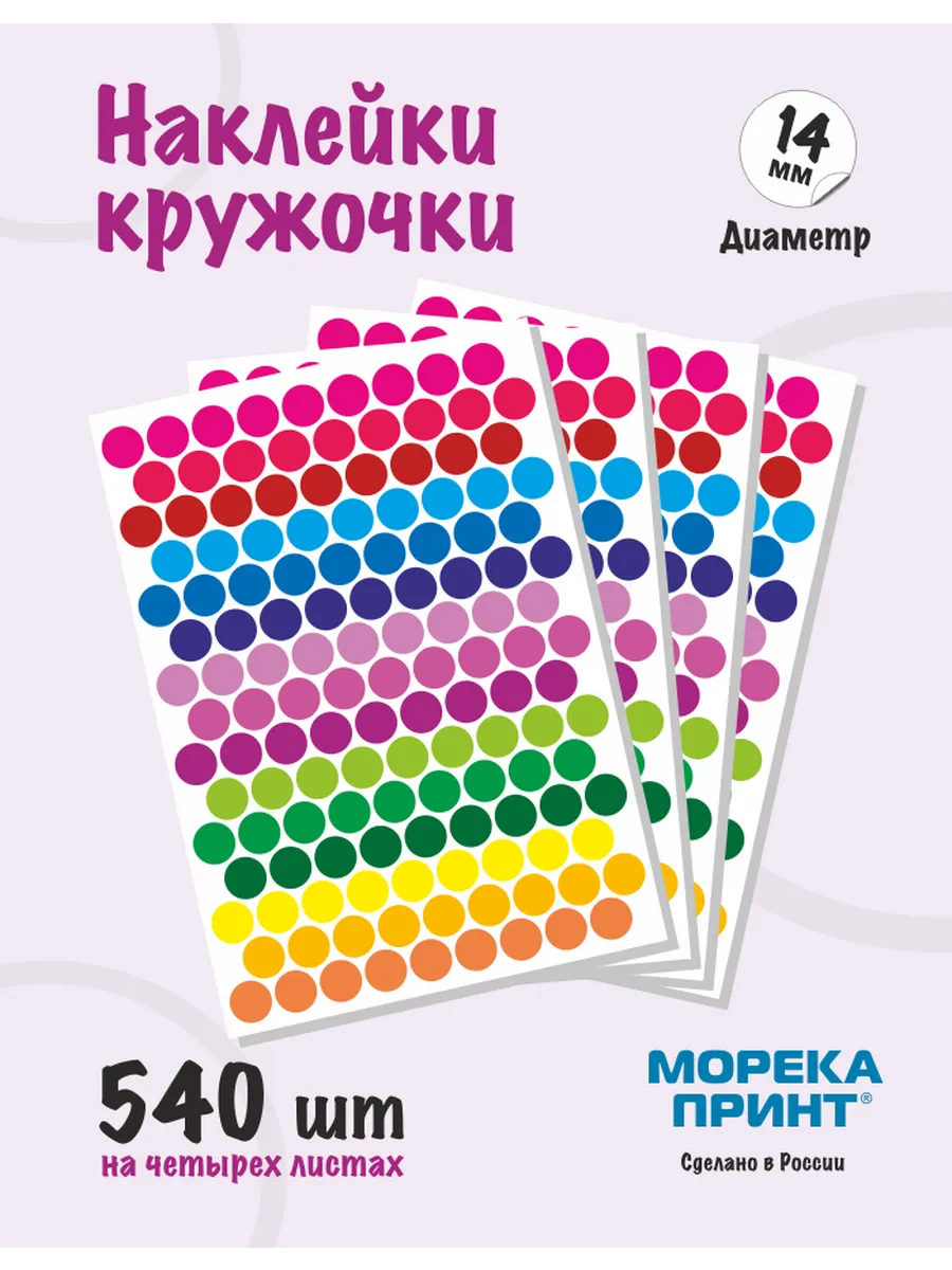 Представляем вам набор наклеек из кружочков от бренда "МорекаПринт" - настоящий праздник цвета и творчества! В этой упаковке вас ждут целых 540 ярких цветных кружочков диаметром 14 мм, готовых вдохновить вас на новые идеи. Представьте, сколько возможностей открывается перед вами: украсить блокноты, добавить акценты в ежедневник, создать уникальные поделки для скрапбукинга или просто разбавить серые будни яркими красками. Эти наклейки станут незаменимыми помощниками в играх и обучении, помогая малышам упорядочивать свои коллекции, учить цвета и развивать мелкую моторику. А еще они просто созданы для того, чтобы радовать глаз! Красный, синий, зеленый, желтый, фиолетовый - выбирайте свой любимый цвет и творите! Наклейки изготовлены из качественной самоклеящейся пленки, поэтому легко крепятся к любой поверхности и держатся надежно. С ними маркировка станет не просто рутиной, а увлекательным процессом.