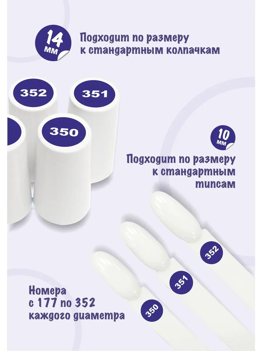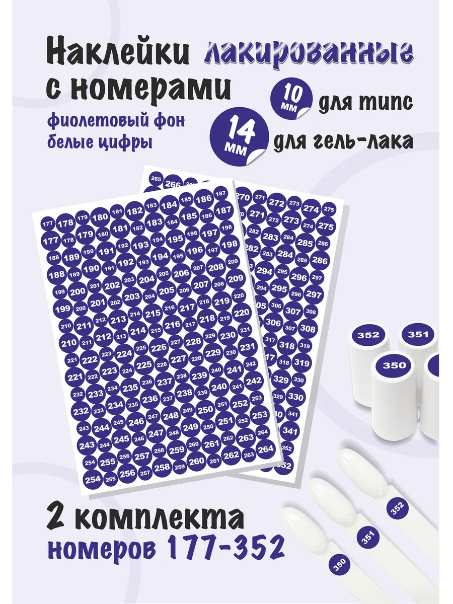 Наклейки c номерами парные круглые для типс и гель лаков. Стикеры для нумерации круглые диаметром 10мм и 14мм с номерами от 177 до 352 каждого диаметра. Всего 352 наклейки обоих диаметров. Вырезаны по контуру и расположены на двух листах 15*21см.