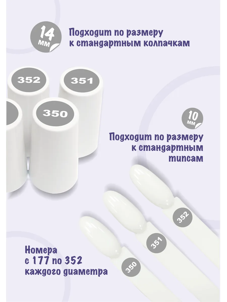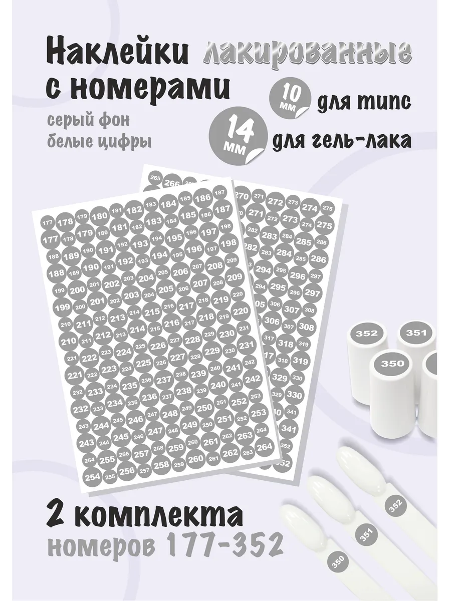 Наклейки c номерами парные круглые для типс и гель лаков. Стикеры для нумерации круглые диаметром 10мм и 14мм с номерами от 177 до 352 каждого диаметра. Всего 352 наклейки обоих диаметров. Вырезаны по контуру и расположены на двух листах 15*21см.