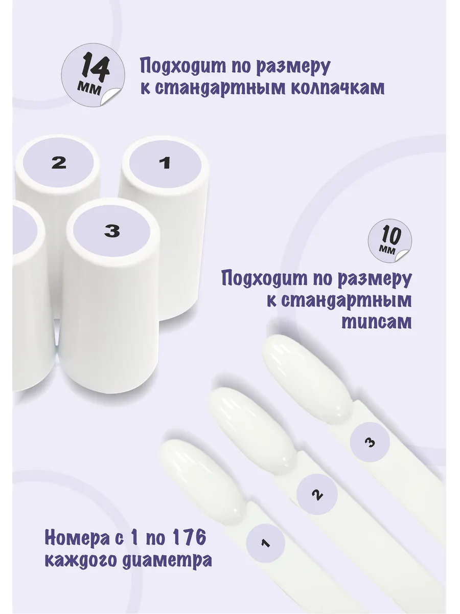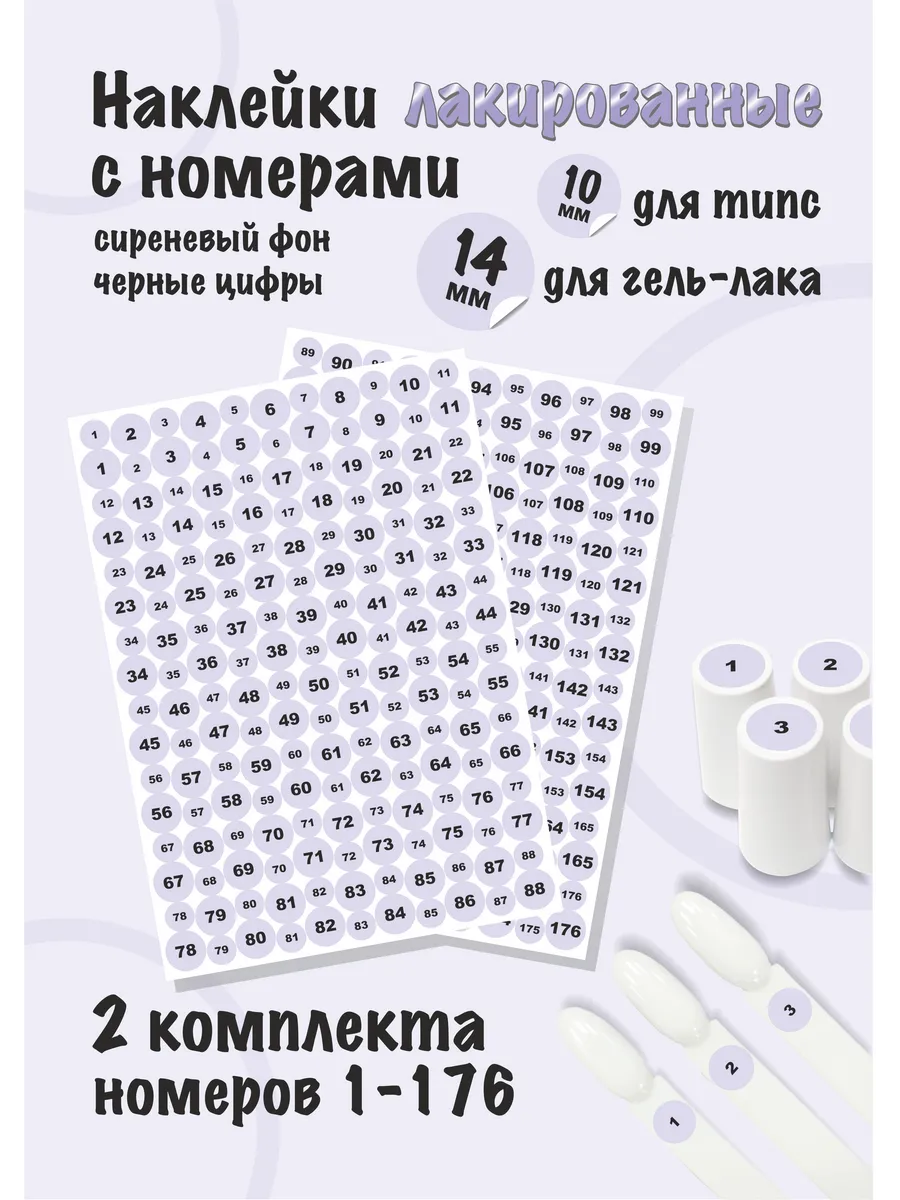 Наклейки c номерами парные круглые для типс и гель лаков. Стикеры для нумерации круглые диаметром 10мм и 14мм с номерами от 1 до 176 каждого диаметра. Всего 352 наклейки обоих диаметров. Вырезаны по контуру и расположены на двух листах 15*21см.
