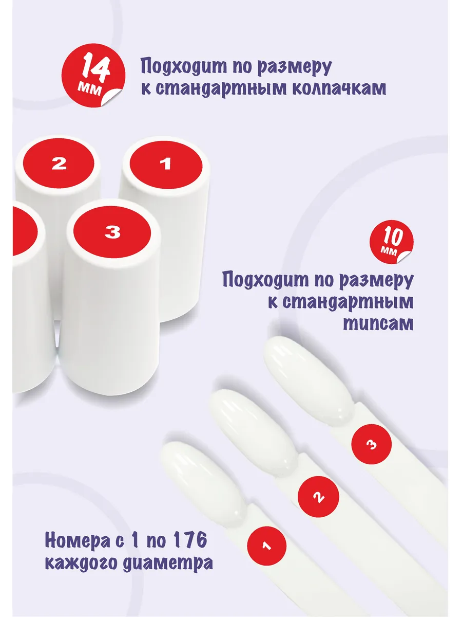 Наклейки диаметром 14мм идеально подходят на верхнюю часть стандартных пластиковых колпачков от флакончиков для гель-лака, а наклейки 10мм помещются на большинство станадртных типс. Поэтому такой набор еще лучше будет смотерться на вашей коллекции.
