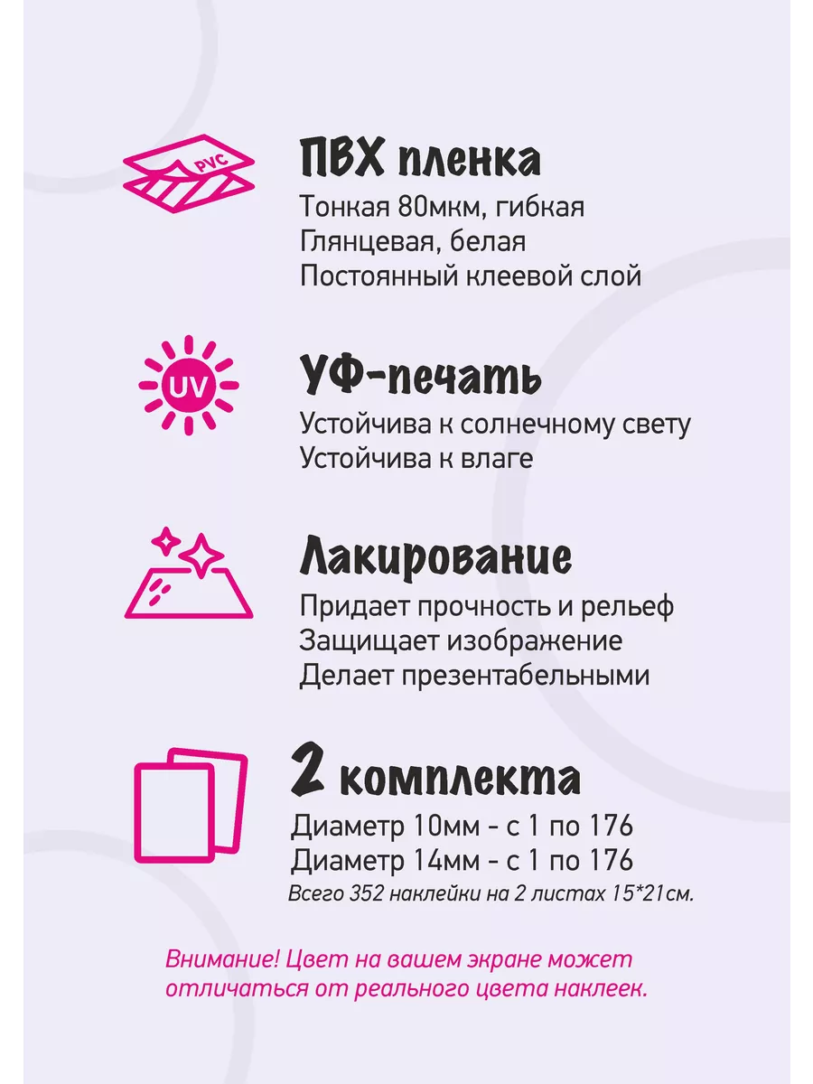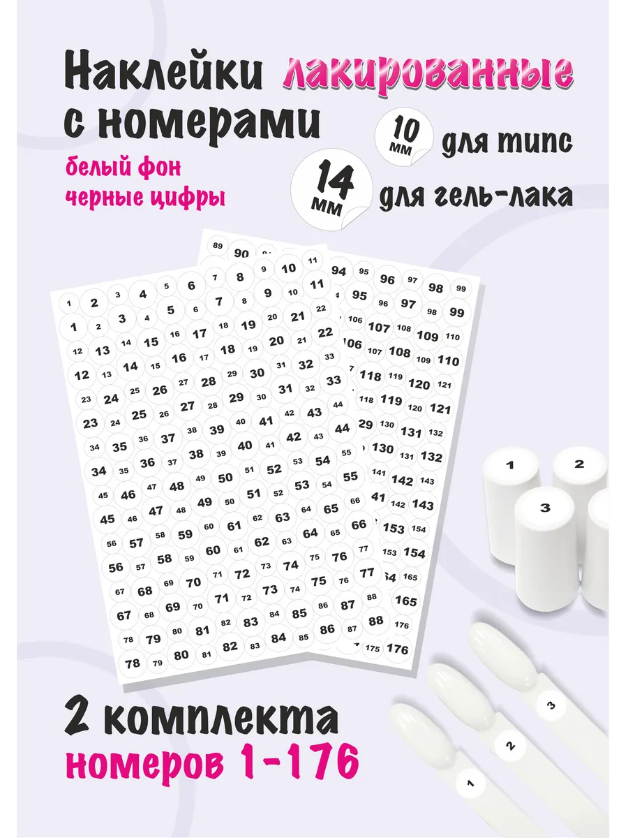 Наклейки c номерами парные круглые для типс и гель лаков. Стикеры для нумерации круглые диаметром 10мм и 14мм с номерами от 1 до 176 каждого диаметра. Всего 352 наклейки обоих диаметров. Вырезаны по контуру и расположены на двух листах 15*21см.