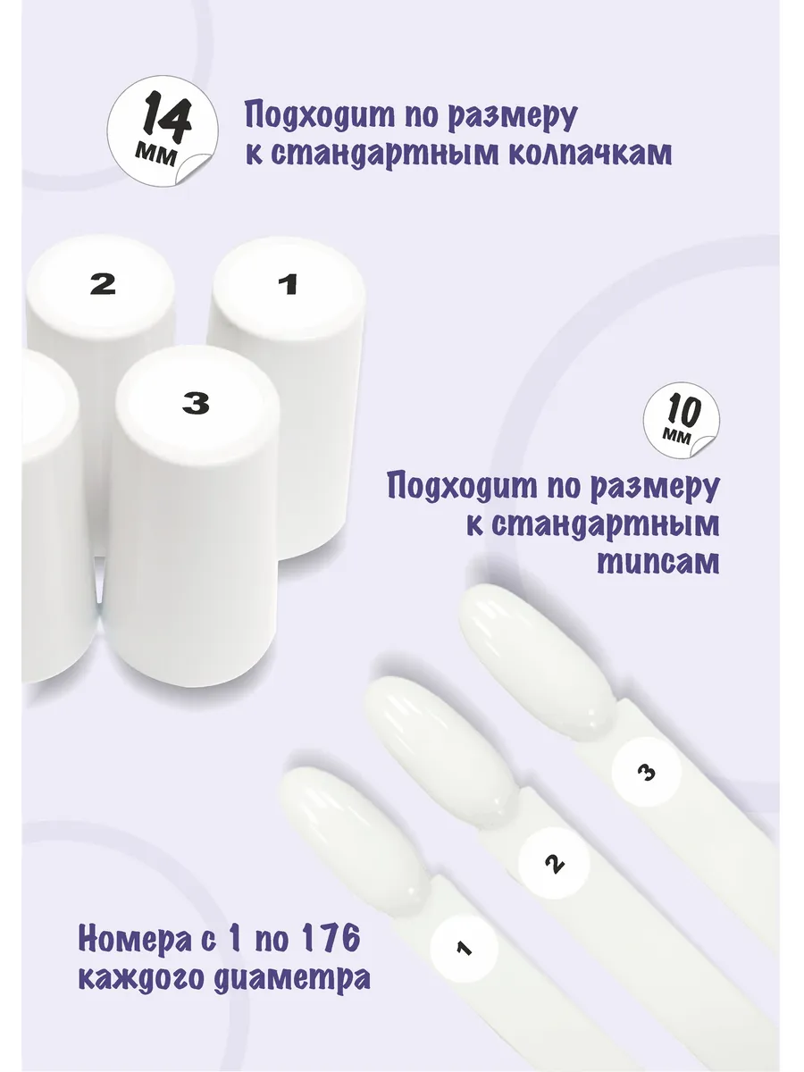 Наклейки диаметром 14мм идеально подходят на верхнюю часть стандартных пластиковых колпачков от флакончиков для гель-лака, а наклейки 10мм помещются на большинство станадртных типс. Поэтому такой набор еще лучше будет смотерться на вашей коллекции.