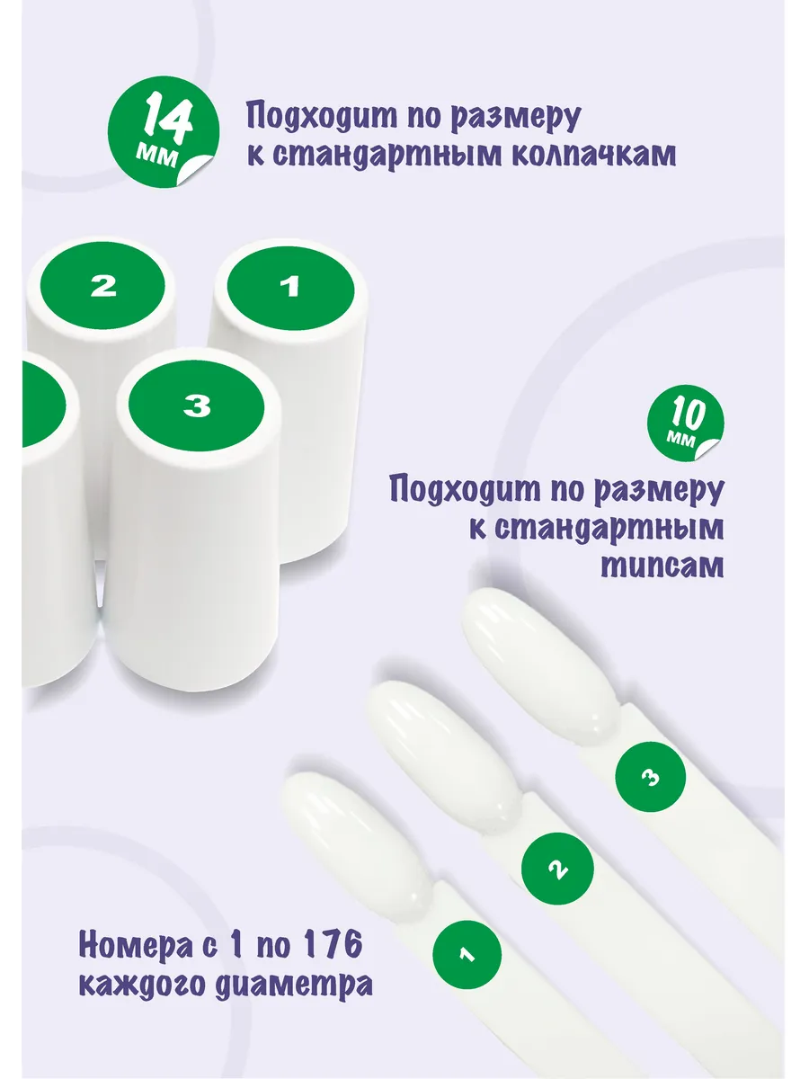 Наклейки диаметром 14мм идеально подходят на верхнюю часть стандартных пластиковых колпачков от флакончиков для гель-лака, а наклейки 10мм помещются на большинство станадртных типс. Поэтому такой набор еще лучше будет смотерться на вашей коллекции.