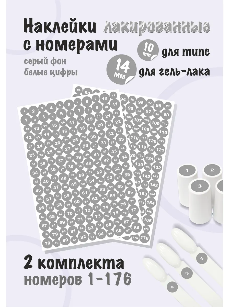 Наклейки c номерами парные круглые для типс и гель лаков. Стикеры для нумерации круглые диаметром 10мм и 14мм с номерами от 1 до 176 каждого диаметра. Всего 352 наклейки обоих диаметров. Вырезаны по контуру и расположены на двух листах 15*21см.