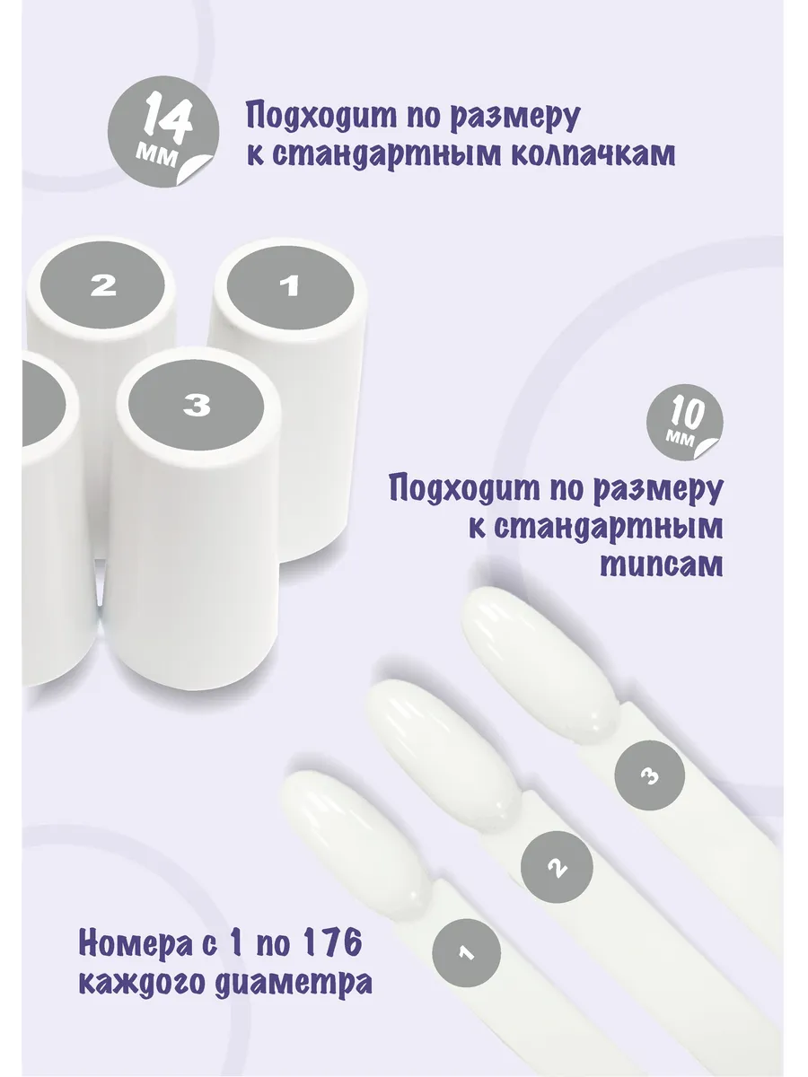 Наклейки диаметром 14мм идеально подходят на верхнюю часть стандартных пластиковых колпачков от флакончиков для гель-лака, а наклейки 10мм помещются на большинство станадртных типс. Поэтому такой набор еще лучше будет смотерться на вашей коллекции.
