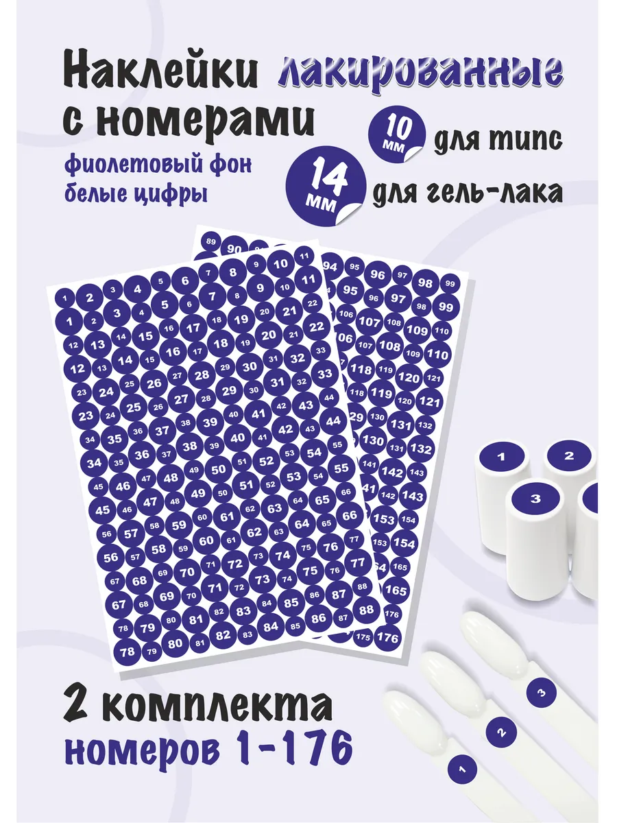 Наклейки c номерами парные круглые для типс и гель лаков. Стикеры для нумерации круглые диаметром 10мм и 14мм с номерами от 1 до 176 каждого диаметра. Всего 352 наклейки обоих диаметров. Вырезаны по контуру и расположены на двух листах 15*21см.