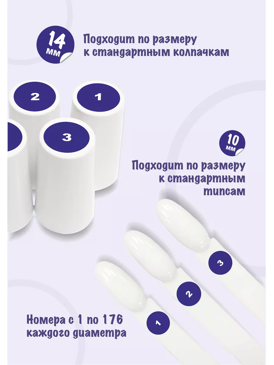 Наклейки диаметром 14мм идеально подходят на верхнюю часть стандартных пластиковых колпачков от флакончиков для гель-лака, а наклейки 10мм помещются на большинство станадртных типс. Поэтому такой набор еще лучше будет смотерться на вашей коллекции.
