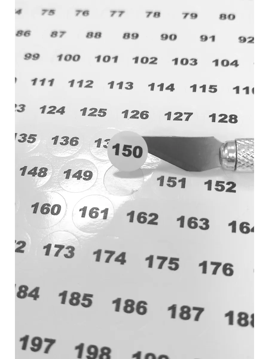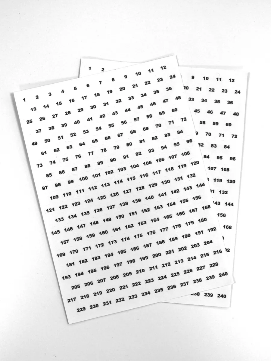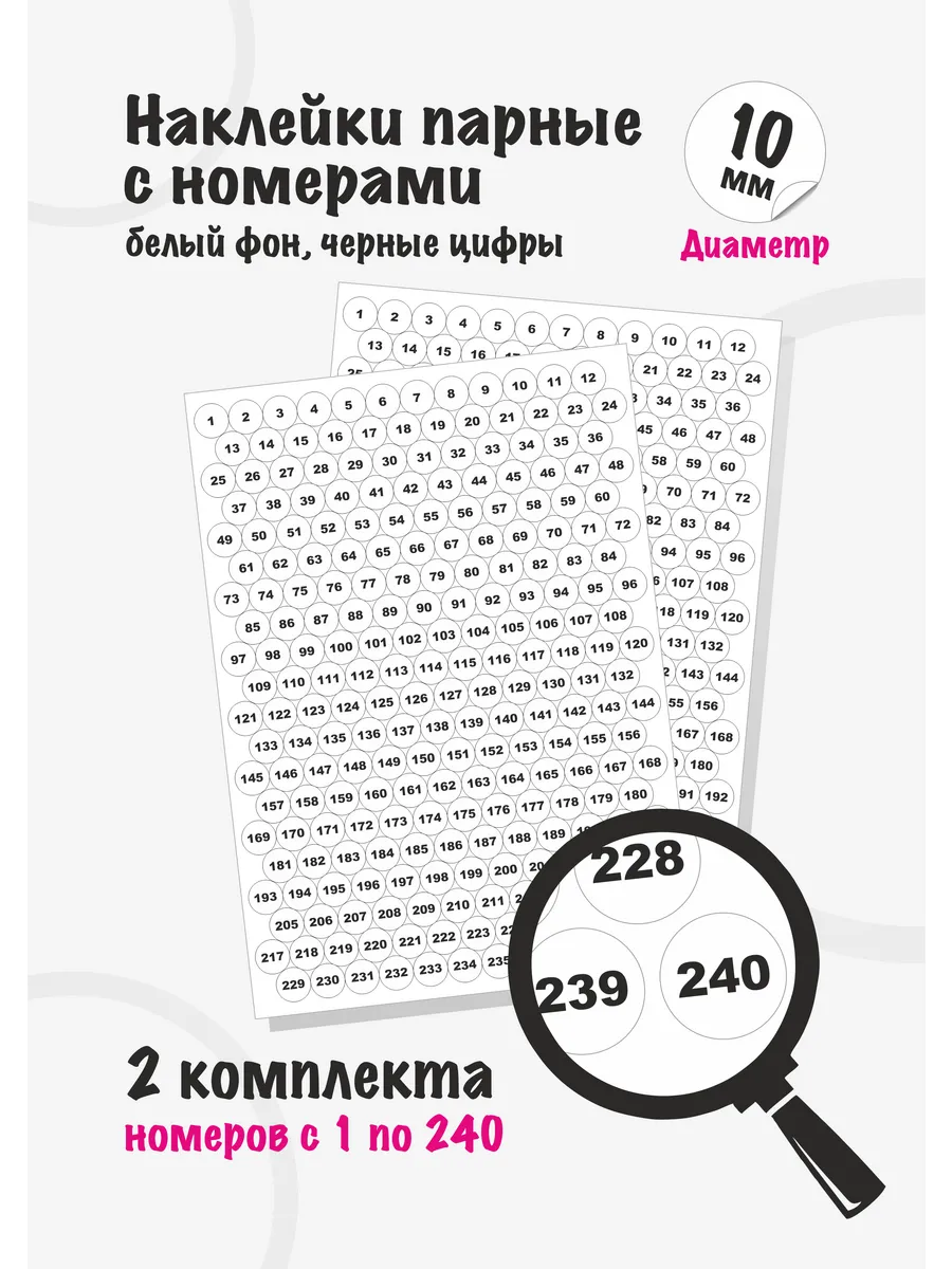 Наклейки парные, круглые, диаметром 10мм, вырезанные по контуру, с номерами от 1 до 240, каждого номера по 2 шт. Цвет фона белый, цвет цифр черный.