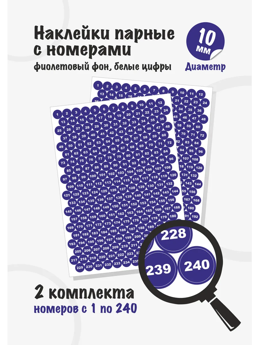 Наклейки парные, круглые, диаметром 10мм, вырезанные по контуру, с номерами от 1 до 240, каждого номера по 2 шт. Цвет фона фиолетовый, цвет цифр белый.