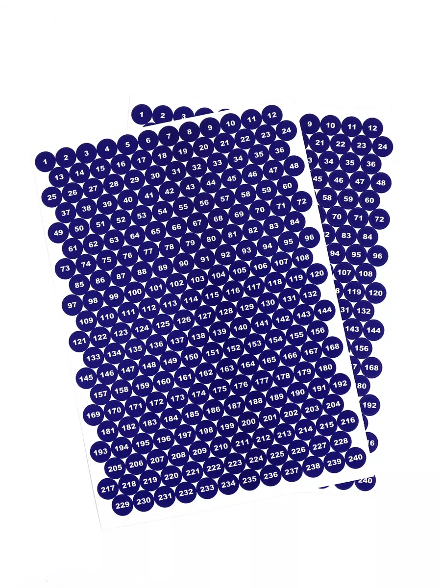 Наклейки диаметром 1см (10мм) с номерами от 1 до 240 расположены на листе 15*21см. В комплекте 2 листа 15*21см. Всего 480 круглых наклеек.