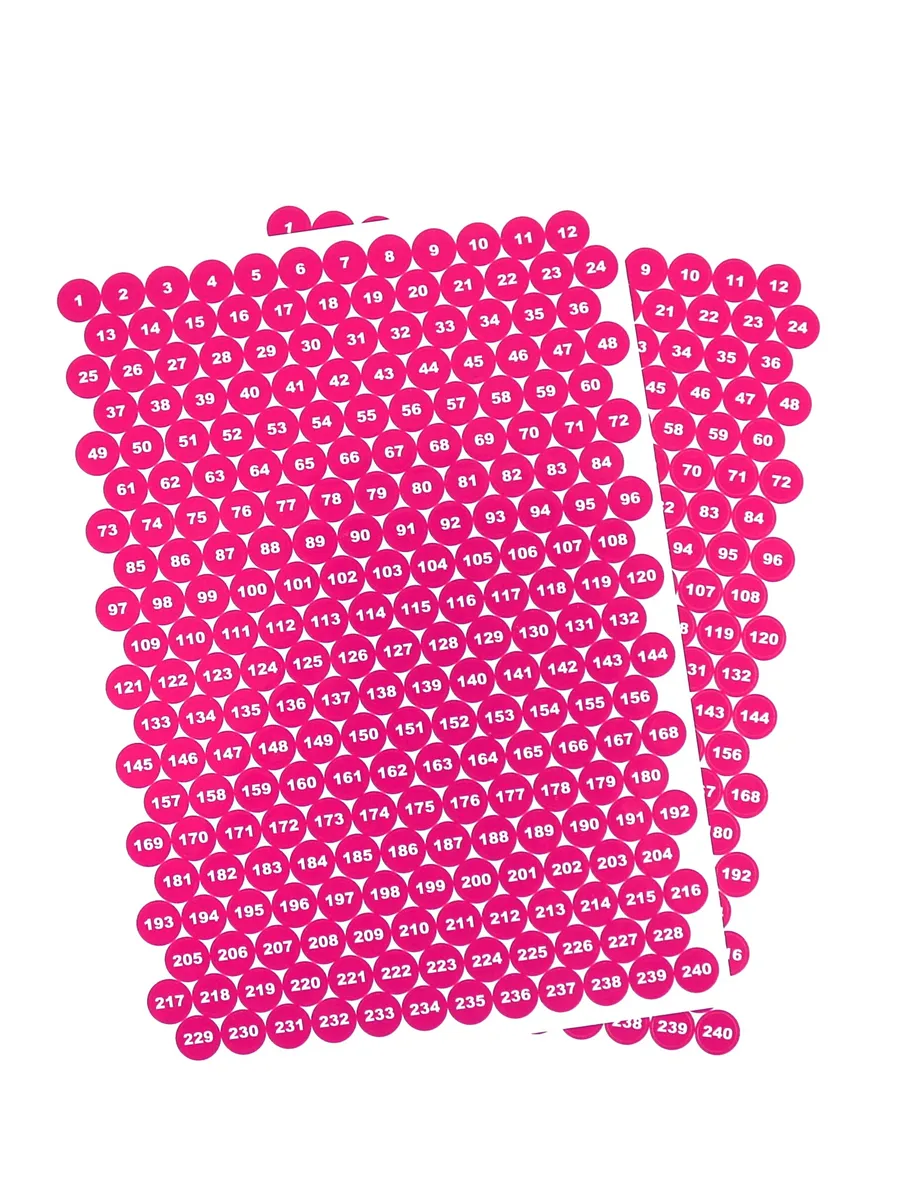 Наклейки парные, круглые, диаметром 10мм, вырезанные по контуру, с номерами от 1 до 240, каждого номера по 2 шт. Цвет фона красно-пурпурный, цвет цифр белый.