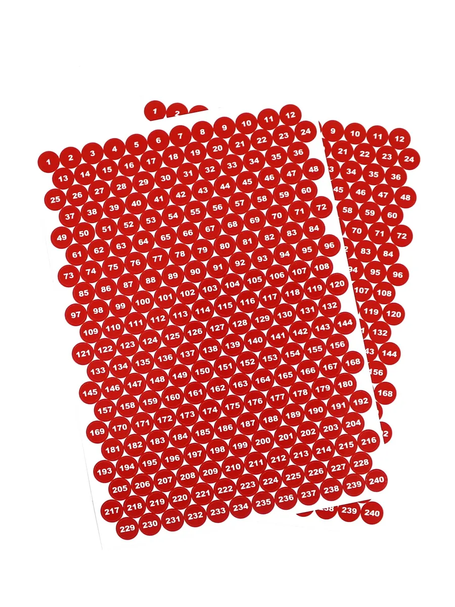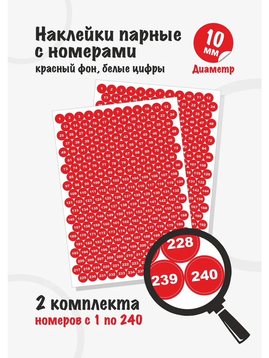 Наклейки парные, круглые, диаметром 10мм, вырезанные по контуру, с номерами от 1 до 240, каждого номера по 2 шт. Цвет фона красный, цвет цифр белый.