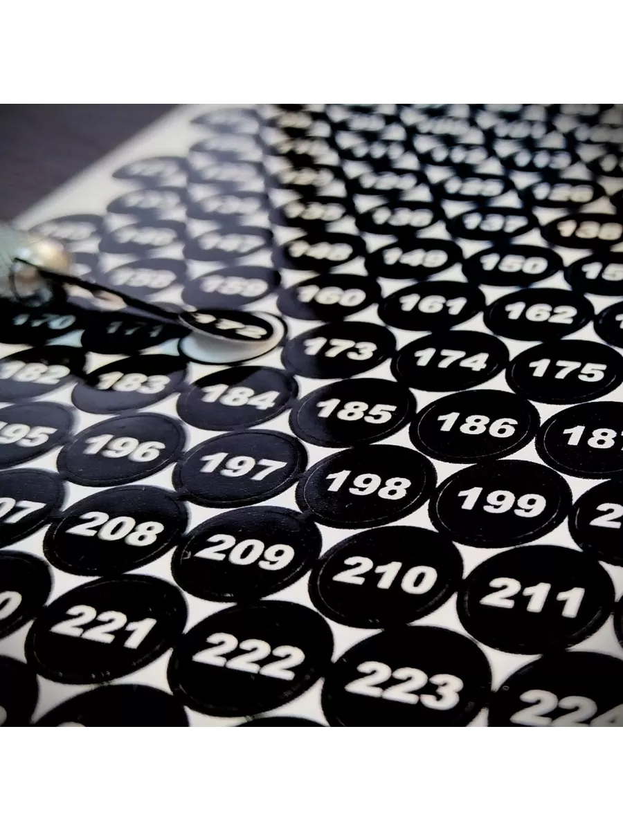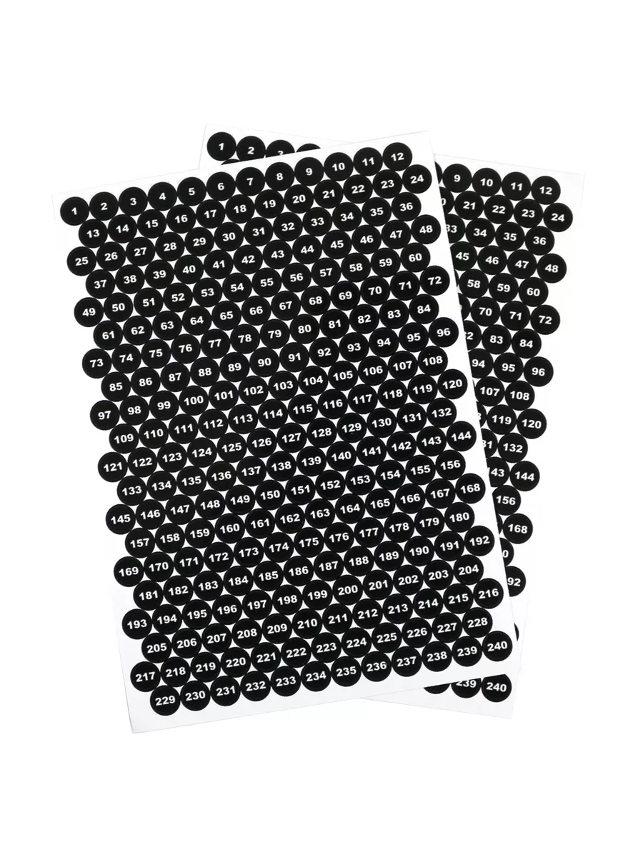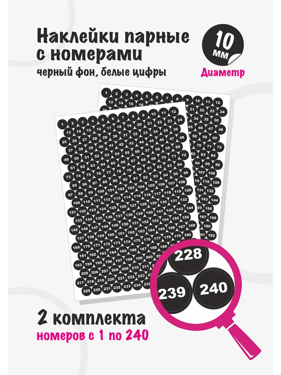 Наклейки парные, круглые, диаметром 10мм, вырезанные по контуру, с номерами от 1 до 240, каждого номера по 2 шт. Цвет фона черный, цвет цифр белый.
