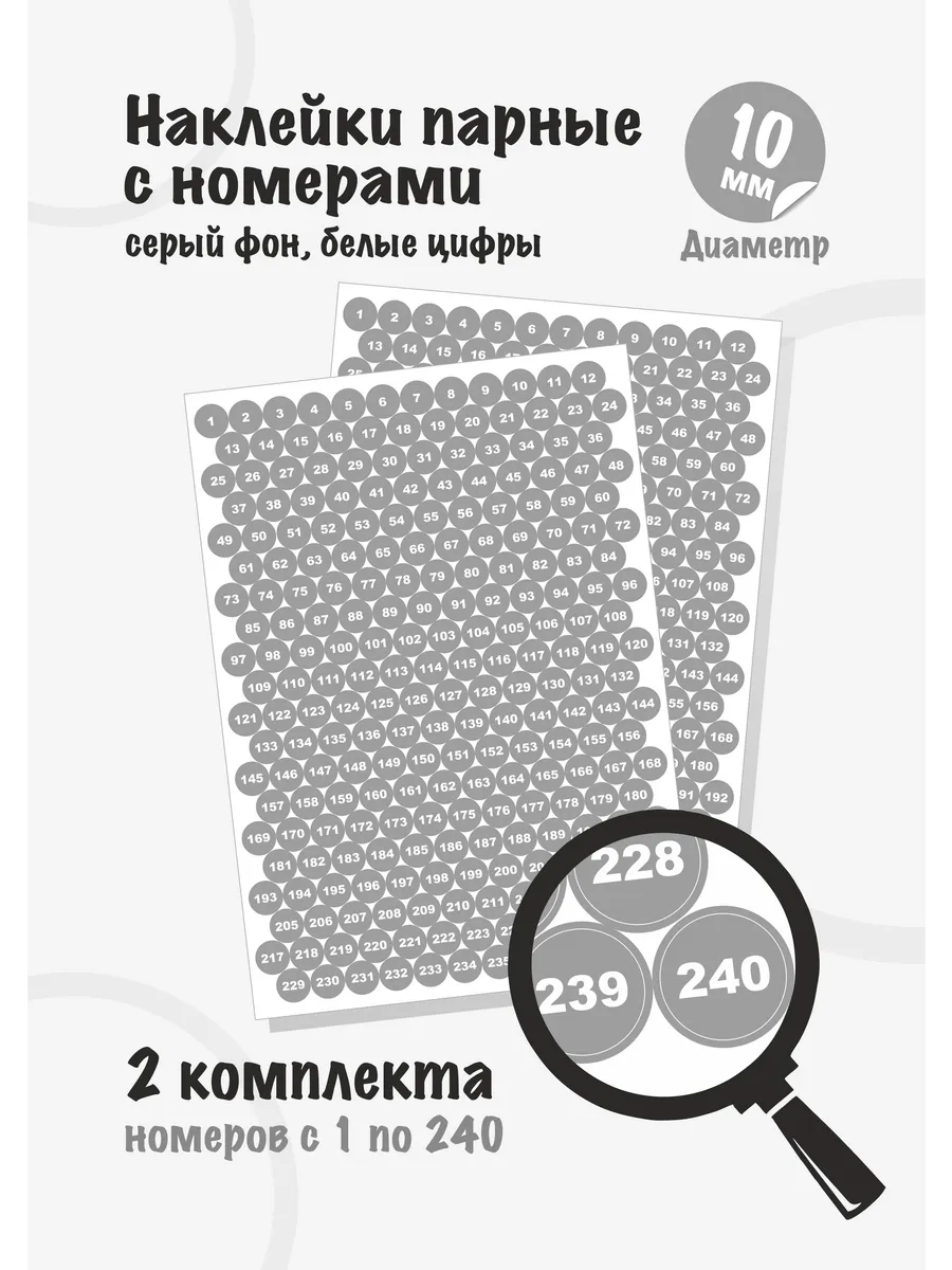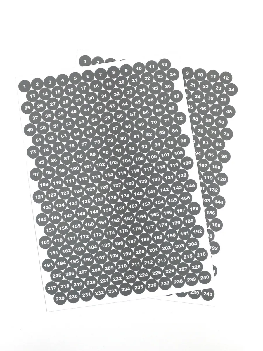 Наклейки парные, круглые, диаметром 10мм, вырезанные по контуру, с номерами от 1 до 240, каждого номера по 2 шт. Цвет фона серый, цвет цифр белый.