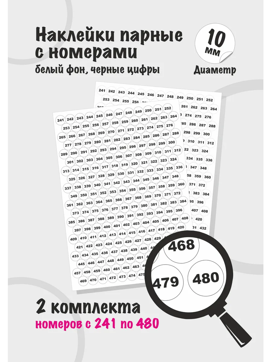 Наклейки парные, круглые, диаметром 10мм, вырезанные по контуру, с номерами от 241 до 480, каждого номера по 2 шт.