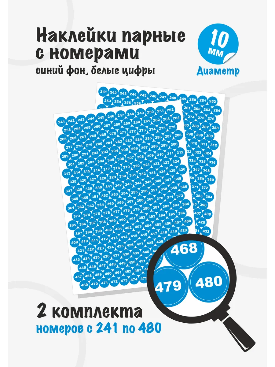 Наклейки диаметром 1см (10мм) с номерами от 241 до 480 расположены на листе 15*21см. В комплекте 2 листа 15*21см. Всего 480 круглых наклеек.