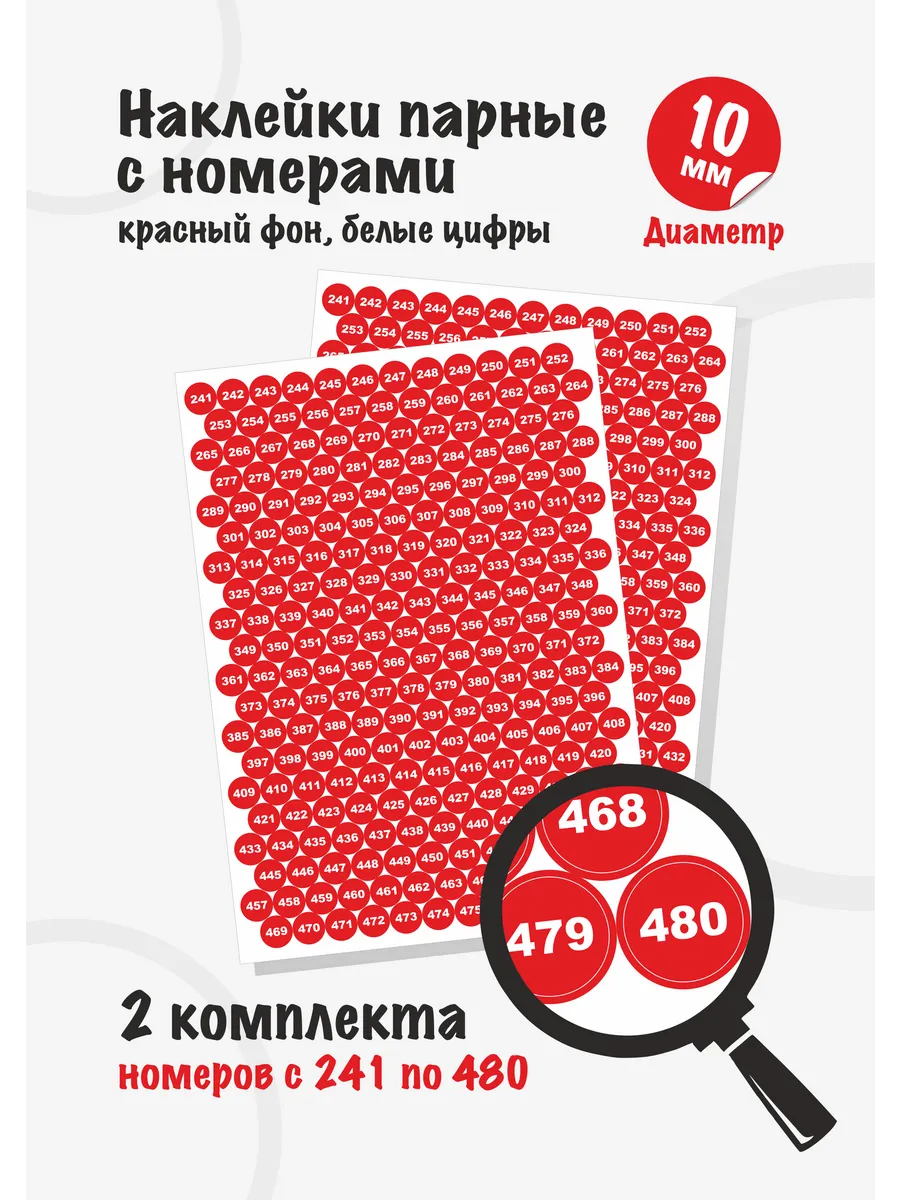 Наклейки парные, круглые, диаметром 10мм, вырезанные по контуру, с номерами от 241 до 480, каждого номера по 2 шт.