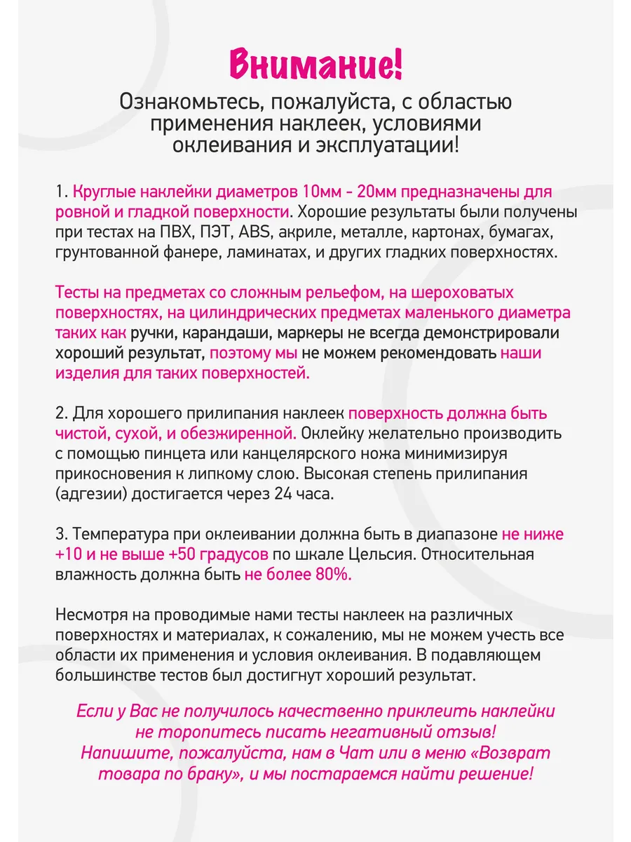 Изделия устойчивы к влаге, солнечным лучам и осадкам. Печать на виниловой ПВХ-пленке осуществляется технологией ультрафиолетовой печати. УФ-печать крепко закрепляет чернила на поверхности пленки, имеет высокое разрешение, а также яркие и сочные цвета. Пленка с постоянным клеевым слоем позволяет крепко приклеиваться к различным поверхностям. Для хорошей адгезии рекомендуем наклеивать наклейки на чистую, сухую и гладкую поверхность. Полная адгезия наступает примерно в течение 24 часов.