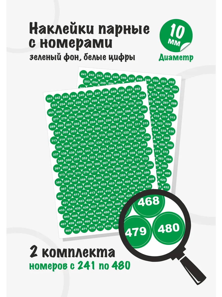 Наклейки диаметром 1см (10мм) с номерами от 241 до 480 расположены на листе 15*21см. В комплекте 2 листа 15*21см. Всего 480 круглых наклеек.