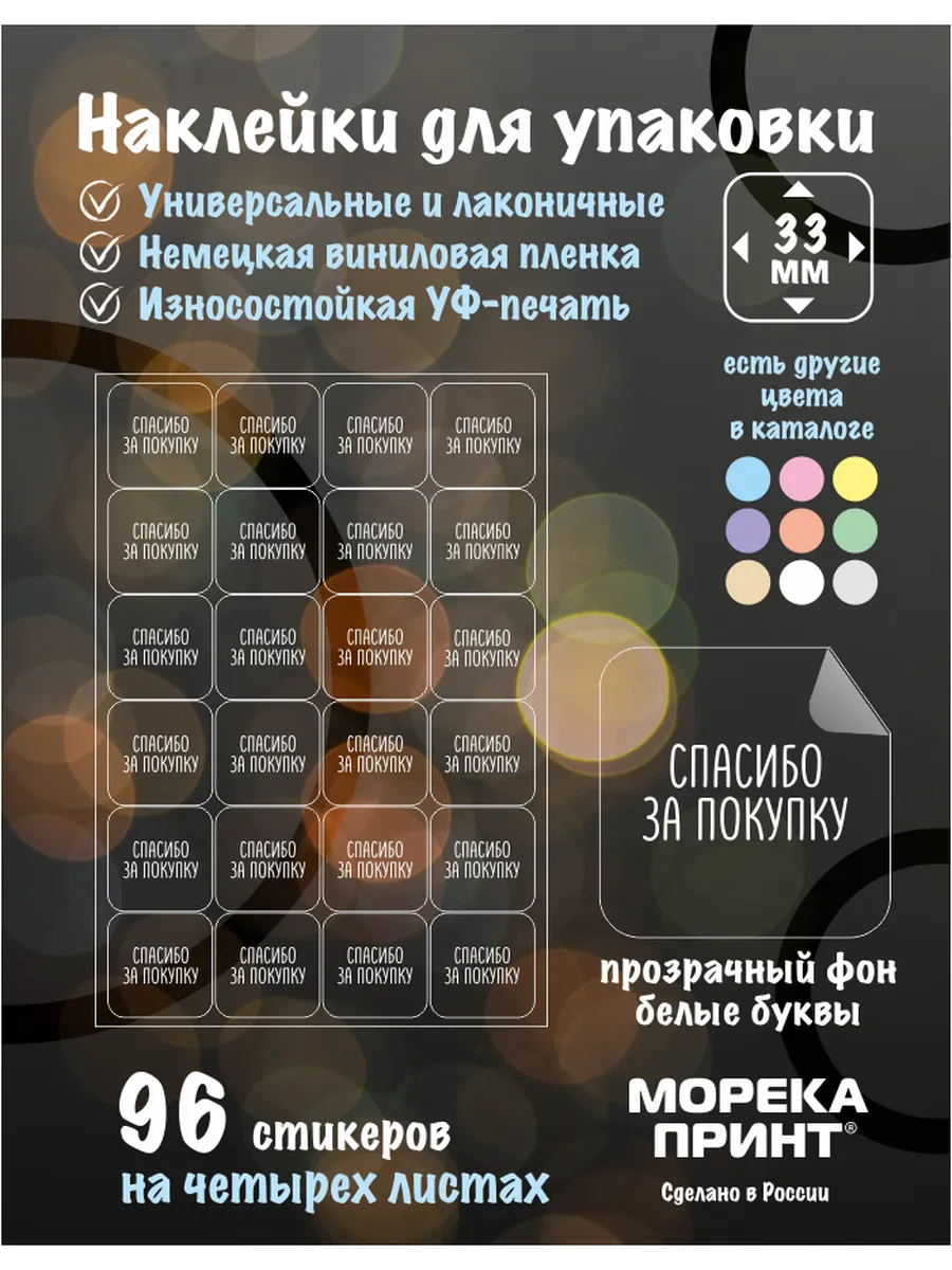 Используя эти наклейки, вы покажете вашим клиентам, что каждый заказ важен для вас, и вы цените их выбор. Стикеры изготовлены методом ультрафиолетовой печати на самоклеящейся виниловой пленке и вырезаны по контуру на профессиональных плоттерах. Такие наклейки имеют ряд преимуществ в сравнении с бумажными наклейками - прочность, долговечность, устойчивость к влаге и выцветанию. Ультрафиолетовая печать прочно закрепляет краски на поверхности прозрачной пленки.