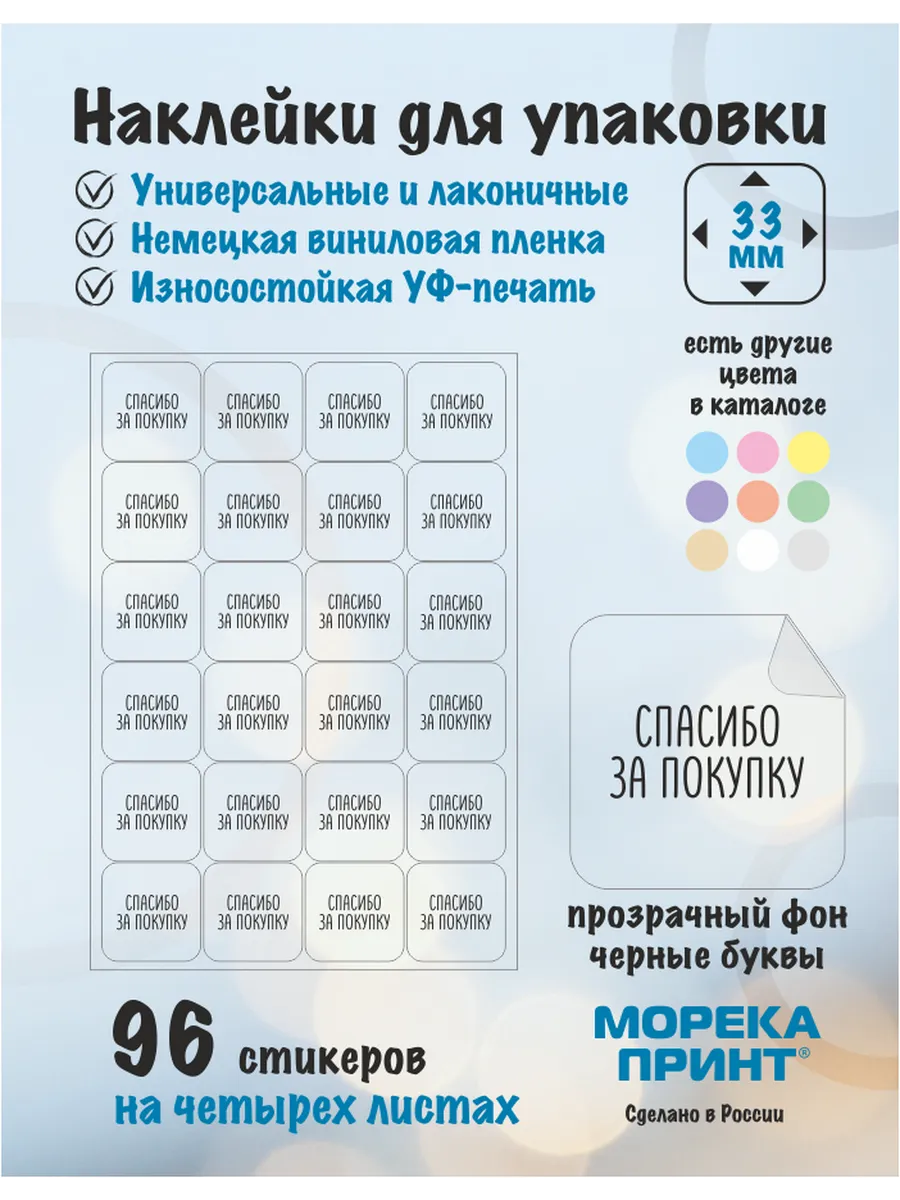 Наши изделия отлично подойдут для упаковки товаров и подарков, а также прекрасно клеятся на пакеты, коробки, флаконы, бутылки и другую тару. Комплект состоит из четырех листов размером А5 (21*15см), на каждом листе по 24 наклейки. Всего 96 штук на четырех листах. Каждая наклейка вырезана по контуру и легко отделяется от подложки. Их лучше использовать на гладкой и ровной поверхности, или поверхностях с небольшим изгибом. Наклейки отлично подходят для пластиковых и картонных упаковок, бумажных и полиэтиленовых пакетов. Температура оклеивания должна быть не ниже +10 градусов по Цельсию. Высокая степень адгезии (прилипания) достигается через 24 часа