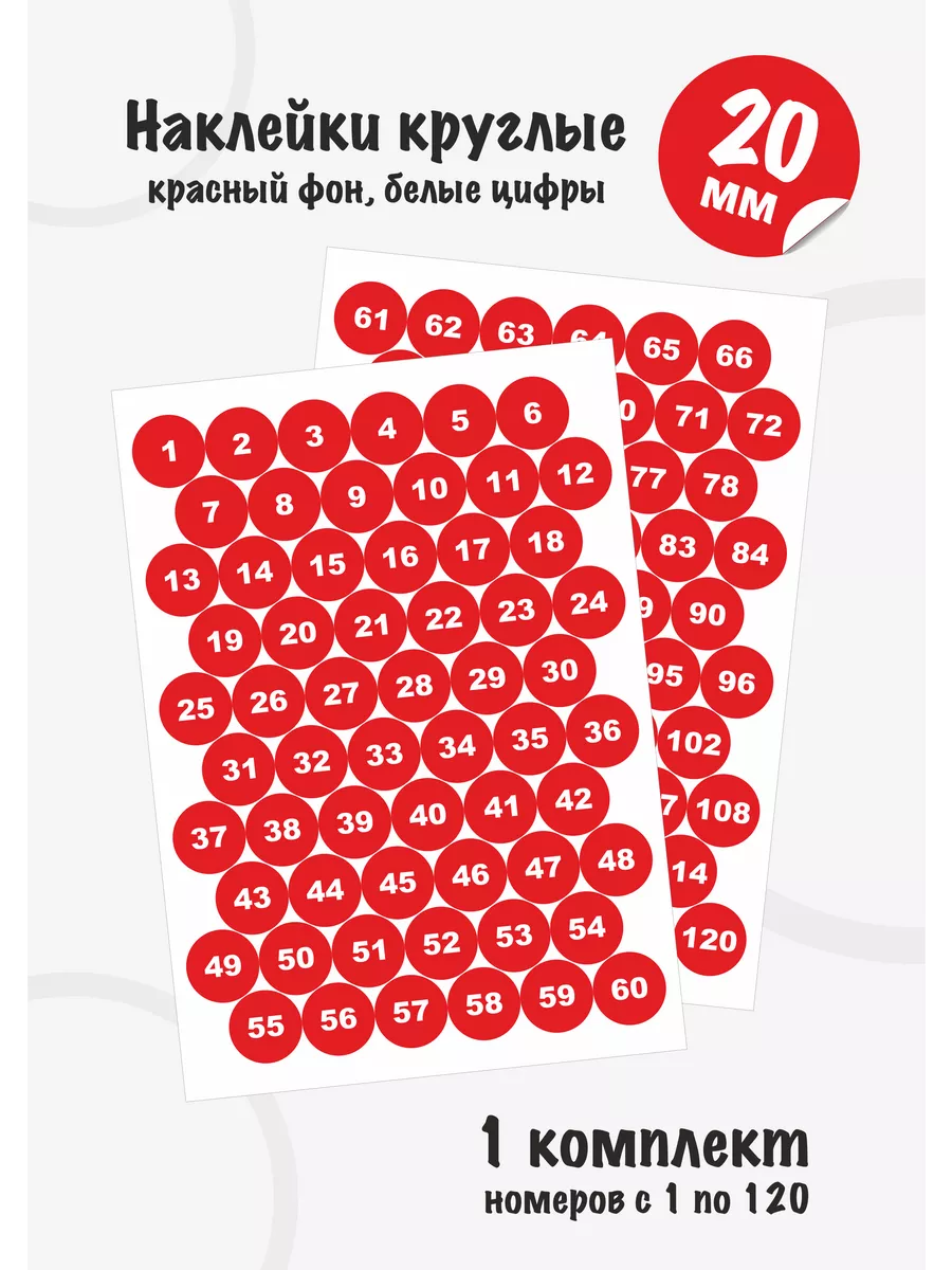 Наклейки диаметром 2см (20мм) с номерами от 1 до 120 расположены на листах 15*21см.