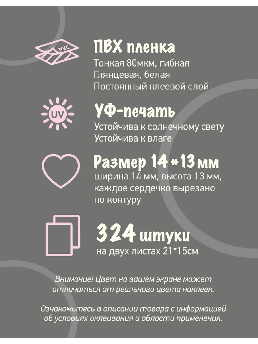 Стикеры сердечки - это идеальное украшение на праздники, такие как День Святого Валентина или 8 марта. Создайте неповторимые открытки, украсьте подарки или оформите романтическую атмосферу для вашей второй половинки, порадуйте своих мам, бабушек, сестер и подруг милыми и трогательными подарками, сделанными с любовью. Этот набор сердечек станет прекрасным подарком для любого случая, ведь любовь и внимание всегда актуальны!