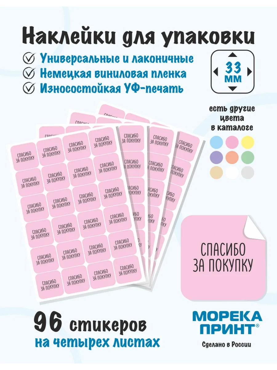 Наши изделия отлично подойдут для упаковки товаров и подарков, а также прекрасно клеятся на пакеты, коробки, флаконы, бутылки и другую тару. Комплект состоит из четырех листов размером А5 (21*15см), на каждом листе по 24 наклейки. Всего 96 штук на четырех листах. Каждая наклейка вырезана по контуру и легко отделяется от подложки. Их лучше использовать на гладкой и ровной поверхности, или поверхностях с небольшим изгибом. Наклейки отлично подходят для пластиковых и картонных упаковок, бумажных и полиэтиленовых пакетов. Температура оклеивания должна быть не ниже +10 градусов по Цельсию. Высокая степень адгезии (прилипания) достигается через 24 часа