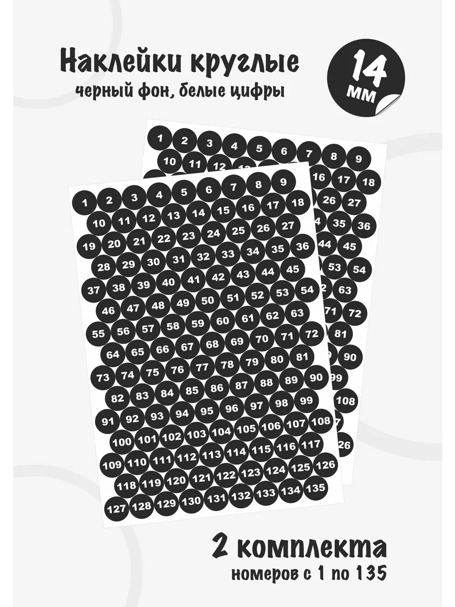 Наклейки диаметром 14мм с номерами от 1 до 135 расположены на листе 15*21см. В комплекте 2 листа 15*21см. Всего 270 круглых наклеек.