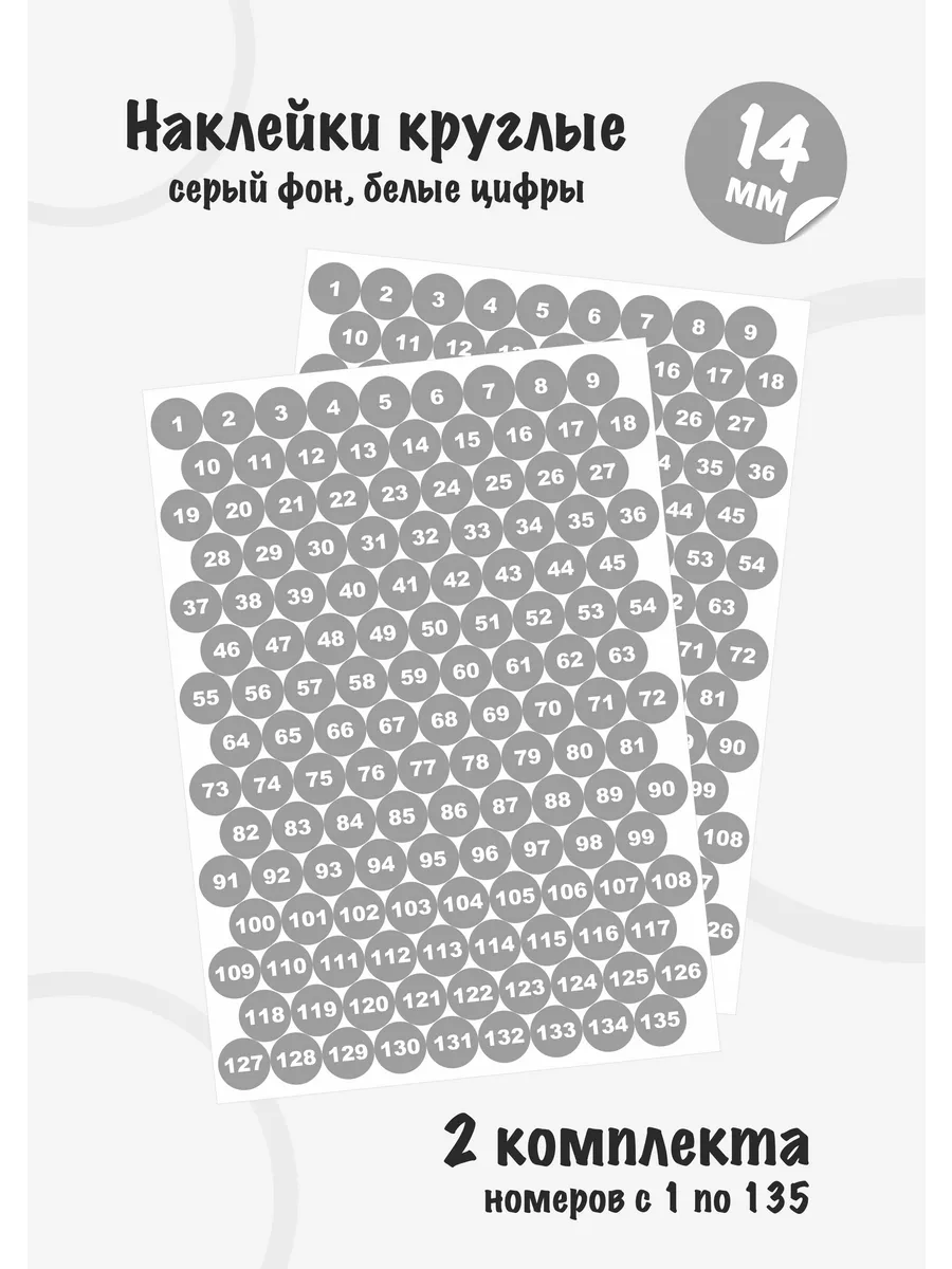 Наклейки парные, круглые, диаметром 14мм, вырезанные по контуру, с номерами от 1 до 135, каждого номера по 2 шт. Цвет фона серый, цвет цифр белый.