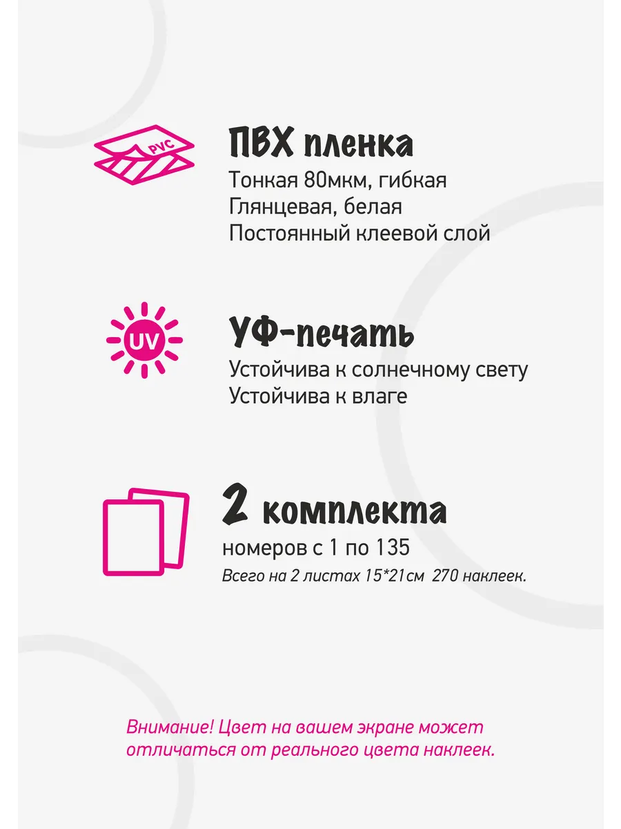 Наклейки диаметром 14мм с номерами от 1 до 135 расположены на листе 15*21см. В комплекте 2 листа 15*21см. Всего 270 круглых наклеек.