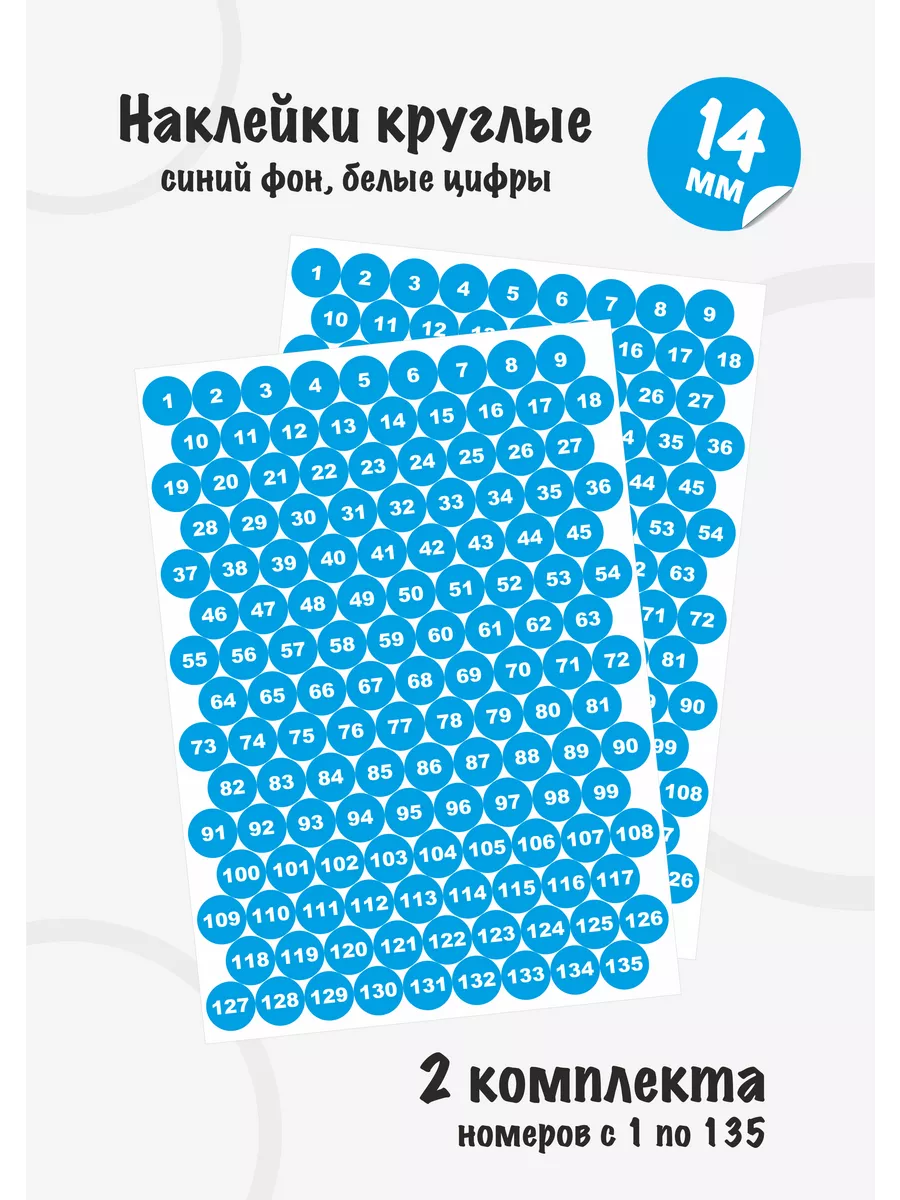 Наклейки парные, круглые, диаметром 14мм, вырезанные по контуру, с номерами от 1 до 135, каждого номера по 2 шт. Цвет фона синий, цвет цифр белый.