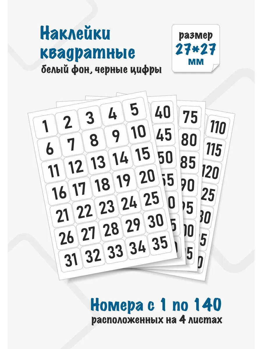 Наклейки для нумерации квадратные размером 27*27мм, со скругленными углами, высота цифр 15мм. Номера от 1 до 140 каждого номера по 1 шт. Всего в комплекте 140 наклеек вырезанных по контуру расположенных на 4 листах. 15*21см.