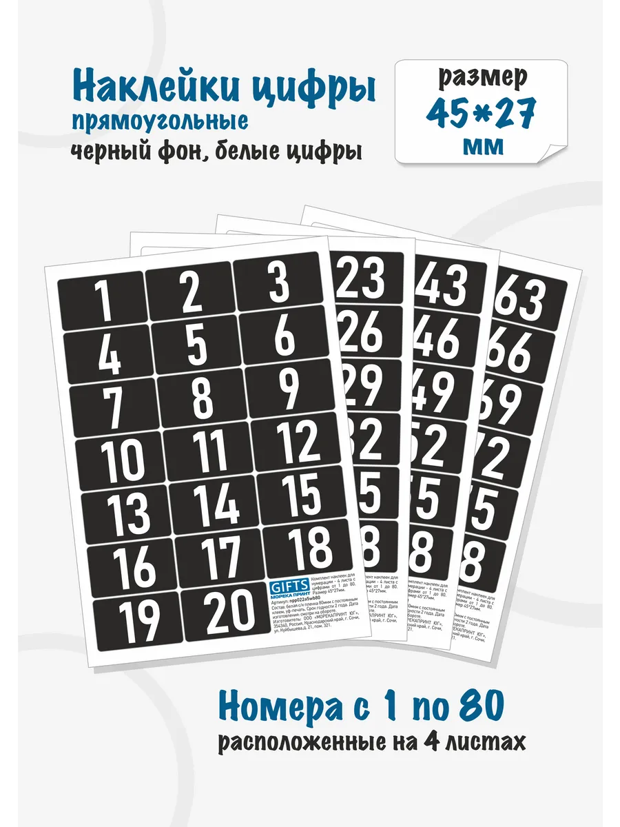 Наклейки для нумерации, прямоугольные размером 45*27мм, со скругленными углами, высота цифр 22мм. Цифры от 1 до 80, каждой по 1 шт. Всего в комплекте 80 наклеек вырезанных по контуру расположеных на 4 листах 15*21см.