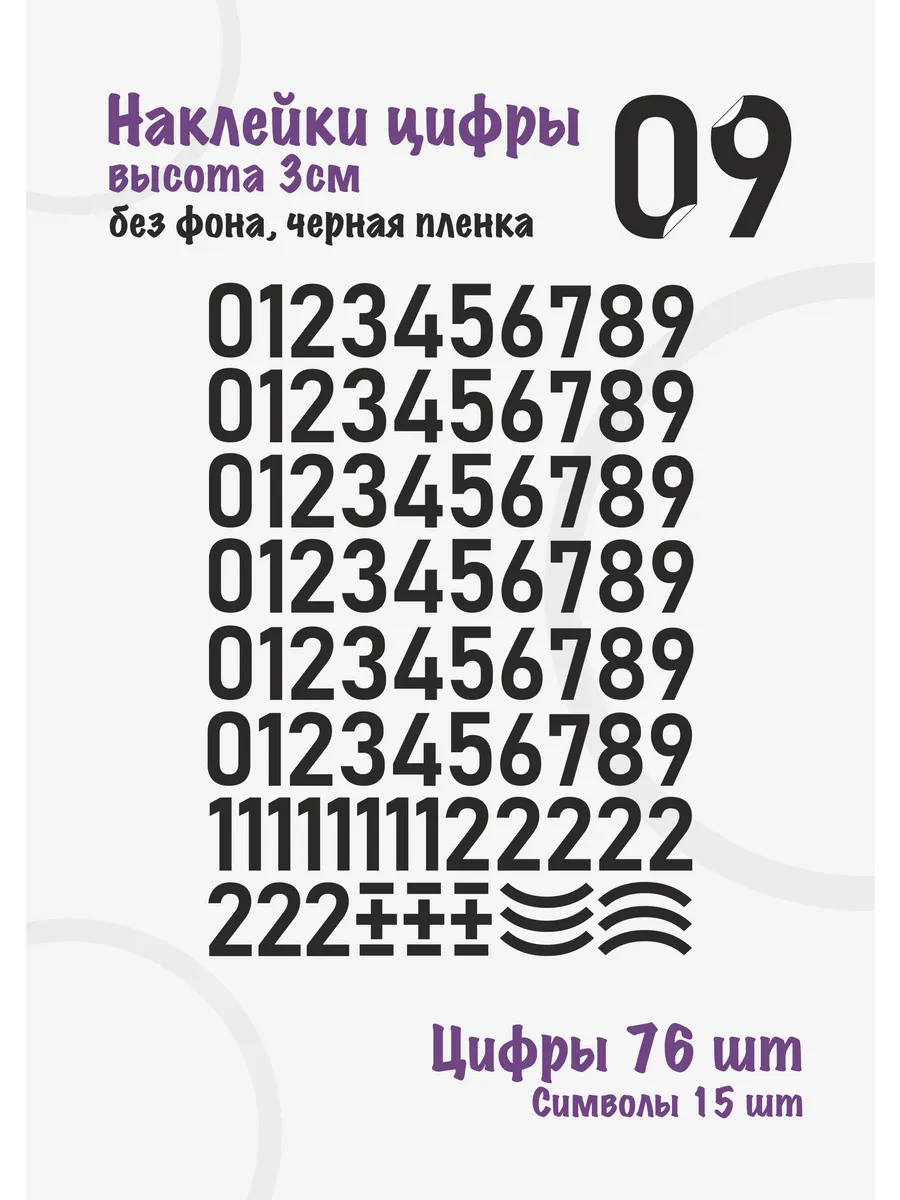 Наклейки цифры от 0 до 9, высота 3см (30мм). Каждая цифра отдельно вырезана по контру. В наборе 6 комплектов цифр от 0 до 9, а также дополнительные цифры 1 и 2 для сквозной нумерации от 1 до 30. Всего 76 цифр. В комплекте, кроме цифр есть 15 символов для оформления телефонного номера - 3 комплекта скобок, 6 тире и 3 плюса. В ассортименте наклейки, вырезанные из белой и черной пленок, а также из металлизированных пленок под золото и серебро.