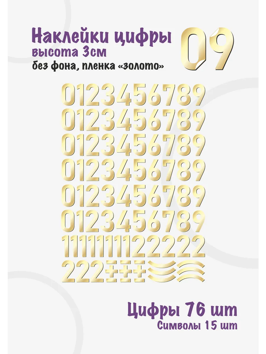 Наклейки цифры от 0 до 9, высота 3см (30мм). Каждая цифра отдельно вырезана по контру. В наборе 6 комплектов цифр от 0 до 9, а также дополнительные цифры 1 и 2 для сквозной нумерации от 1 до 30. Всего 76 цифр. В комплекте, кроме цифр есть 15 символов для оформления телефонного номера - 3 комплекта скобок, 6 тире и 3 плюса. В ассортименте наклейки, вырезанные из белой и черной пленок, а также из металлизированных пленок под золото и серебро.